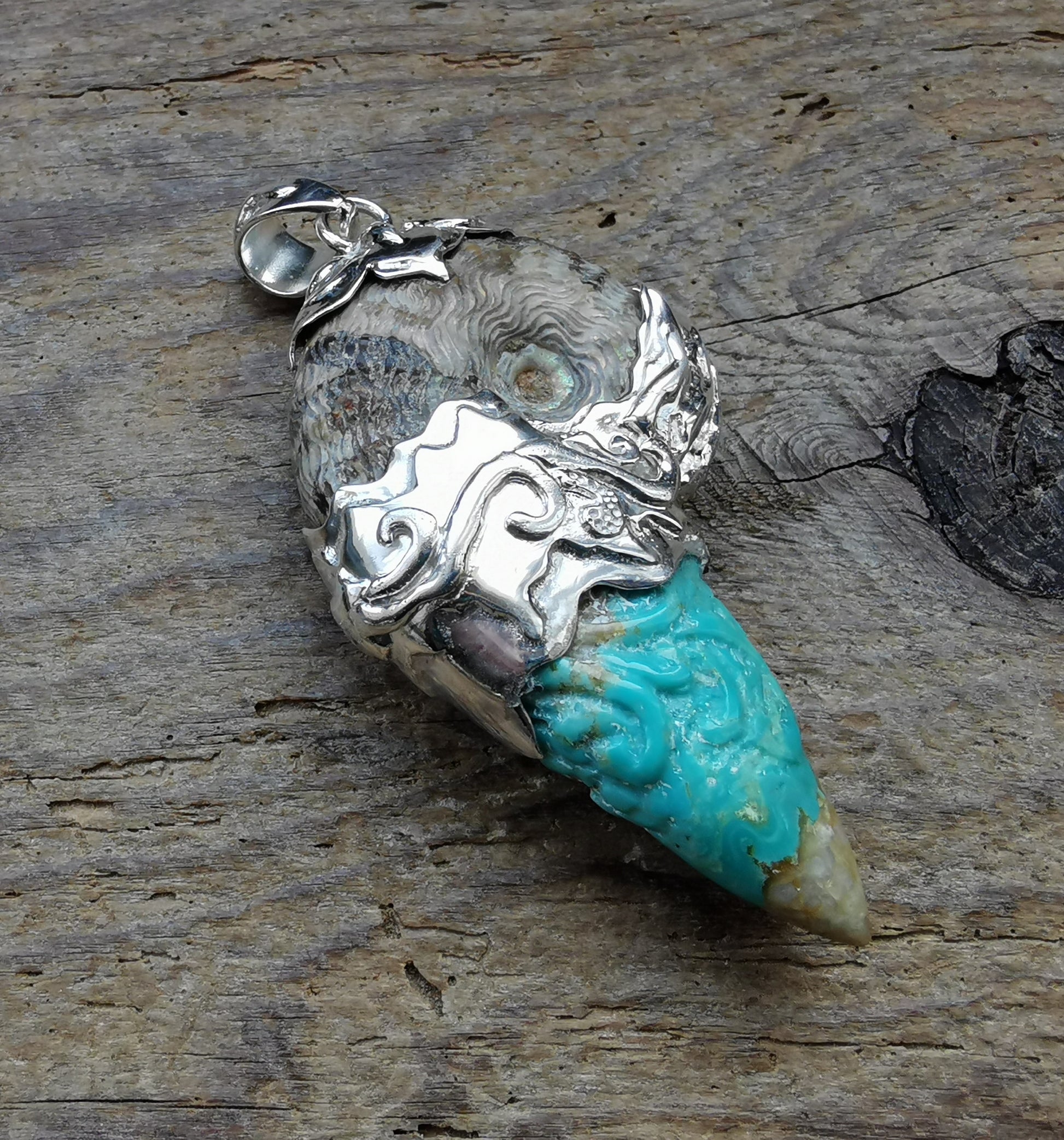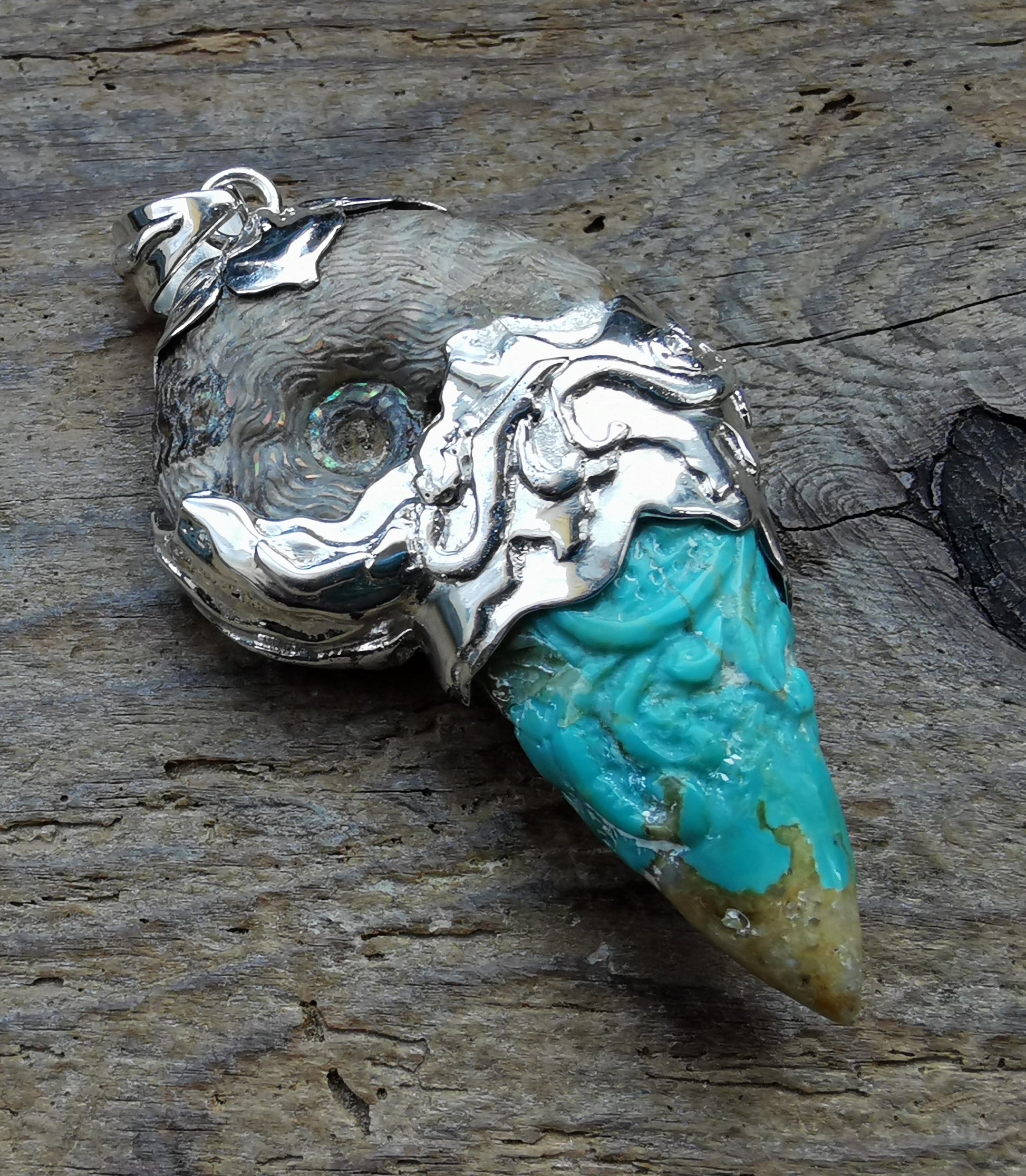 Ref.PD0943 - Silver pendant with ammonite fossil, and turquoise gemstone.