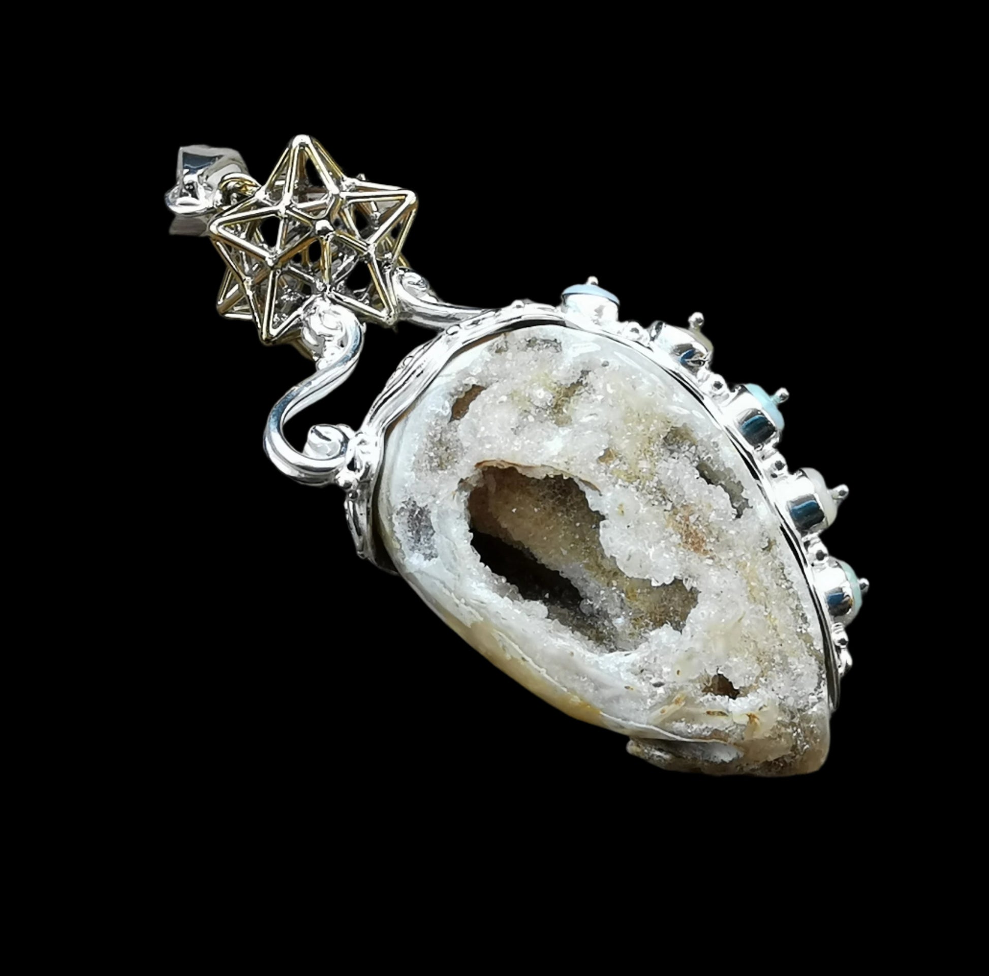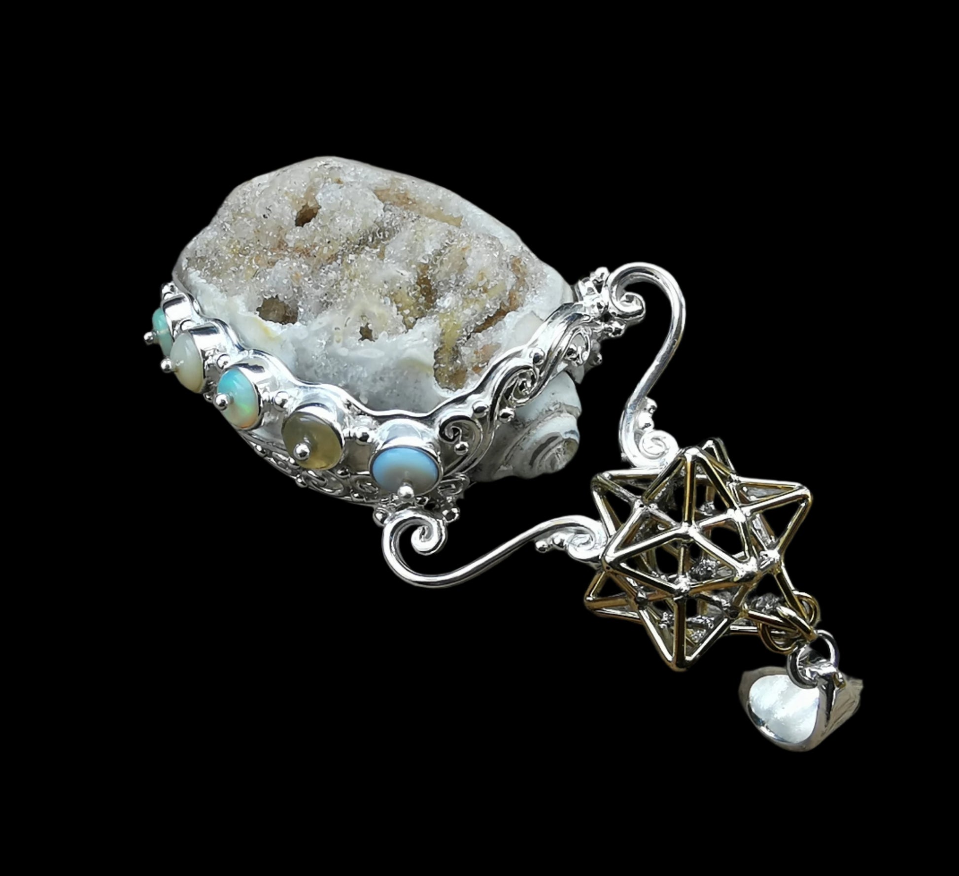 Ref.PD0944 - Silver pendant with brass Solar Star geometry, fossil druzy shell, and opal gemstones.