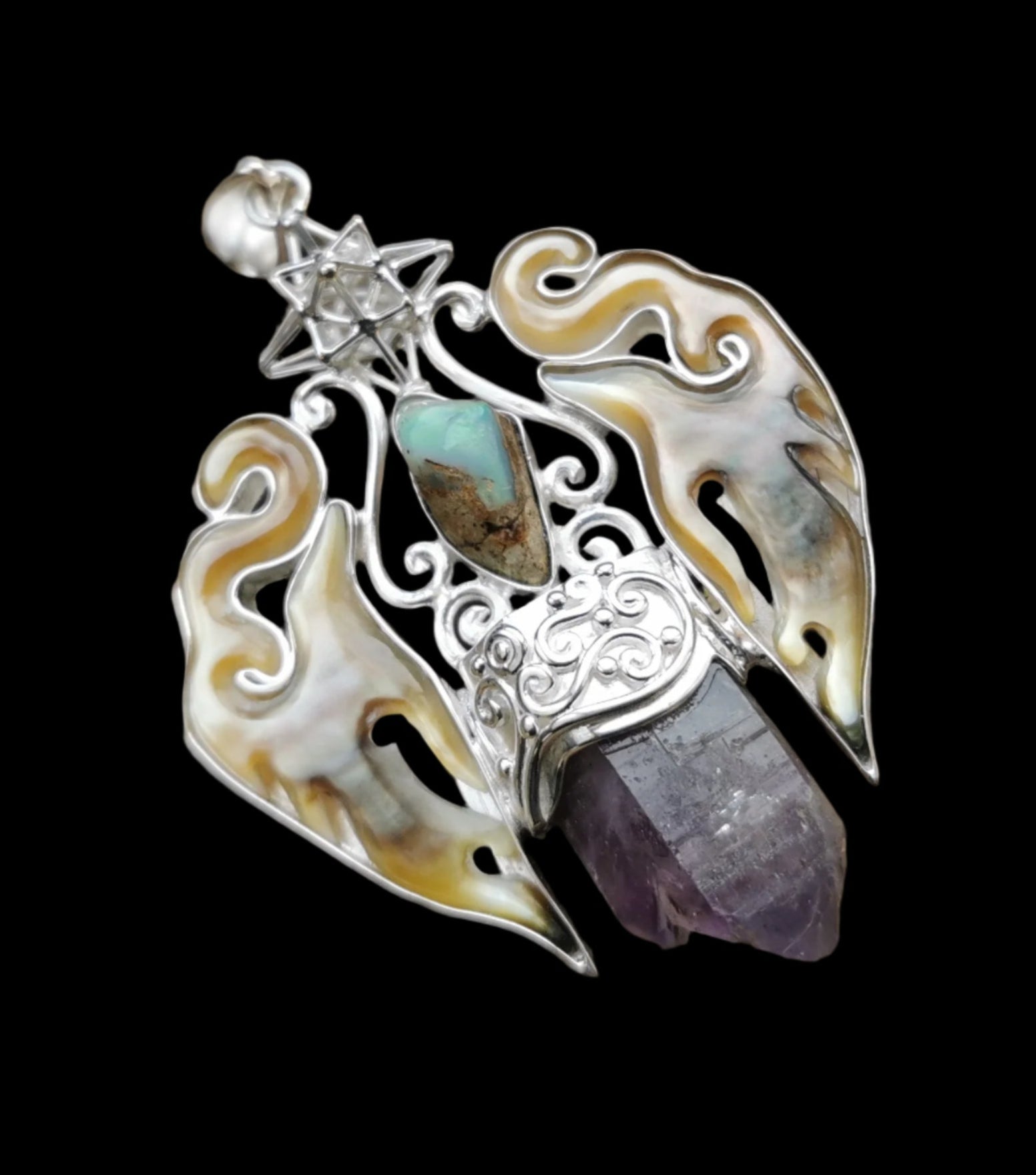 Ref.PD0945 - Silver pendant with Heart Star geometry, mother of pearl carved flames, opal, and Brandberg amethyst gemstones.