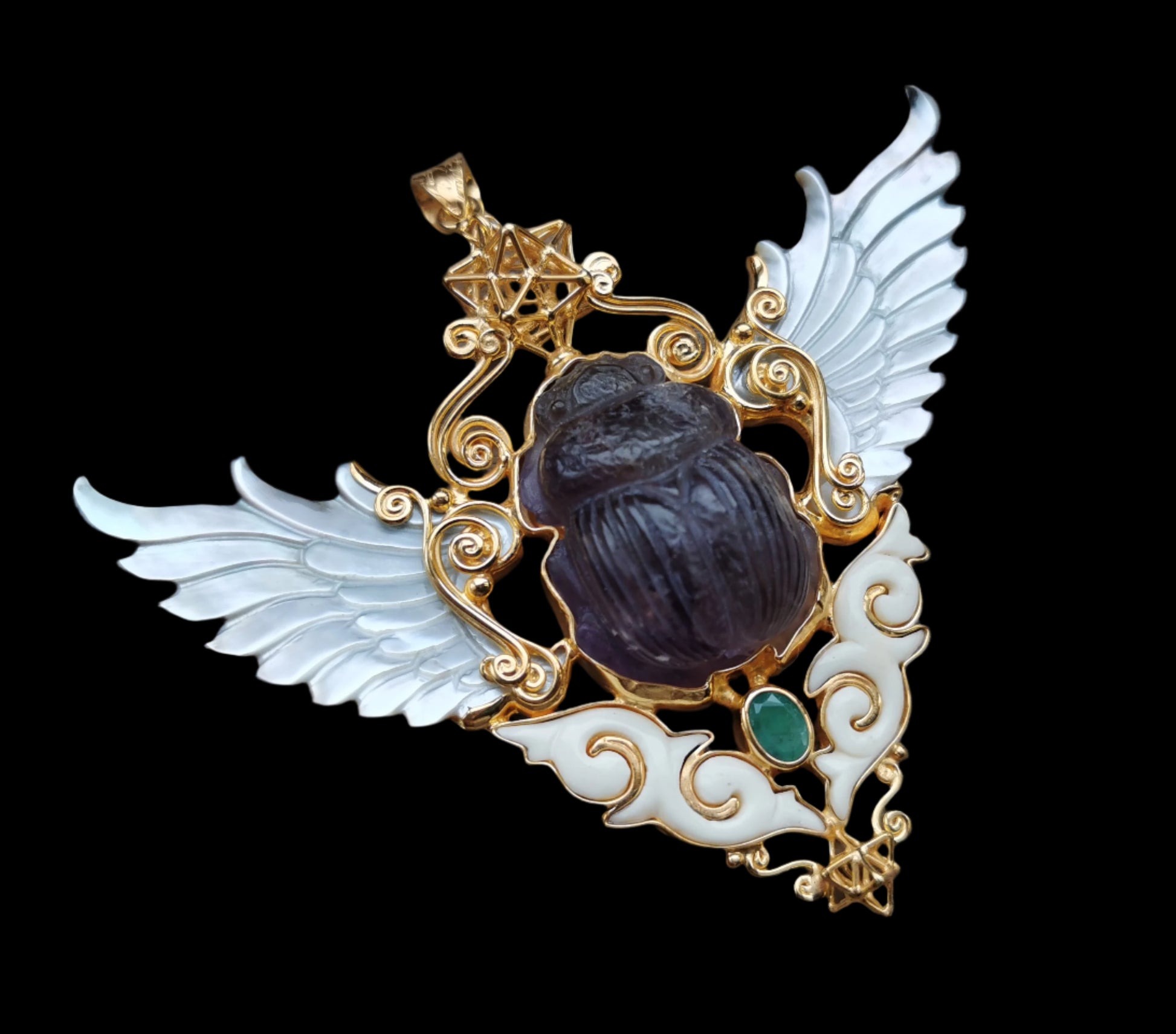 Ref.PD0959 - Gold plated on silver pendant with Solar Star & Tantric Star geometries, mother of pearl carved wings, ecologically sourced deer horn carved clouds, amethyst carved scarab, and emerald gemstones.