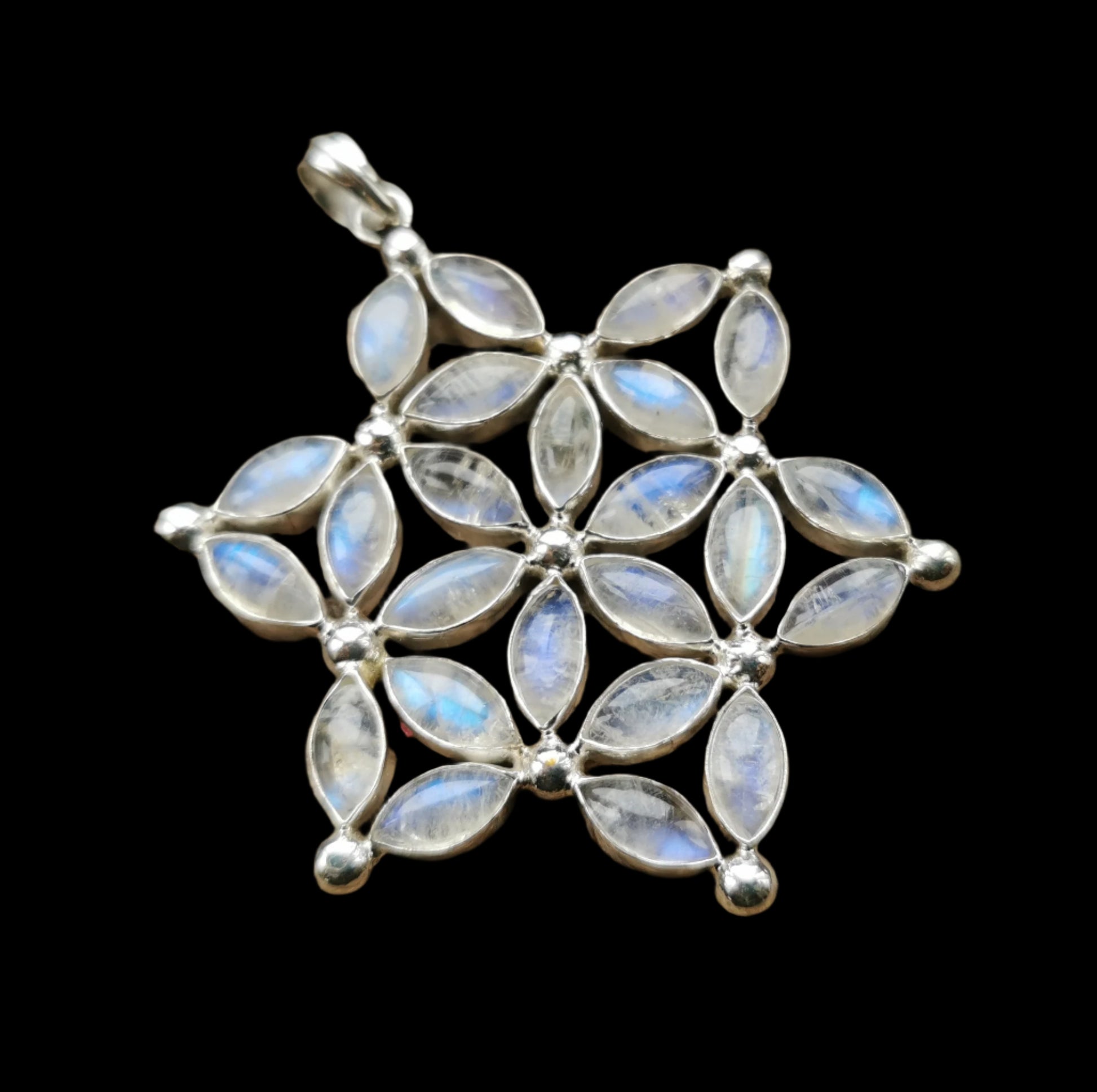 Ref.PD0963 - Silver pendant with moonstone gems depicting a Solar Mandala geometry.