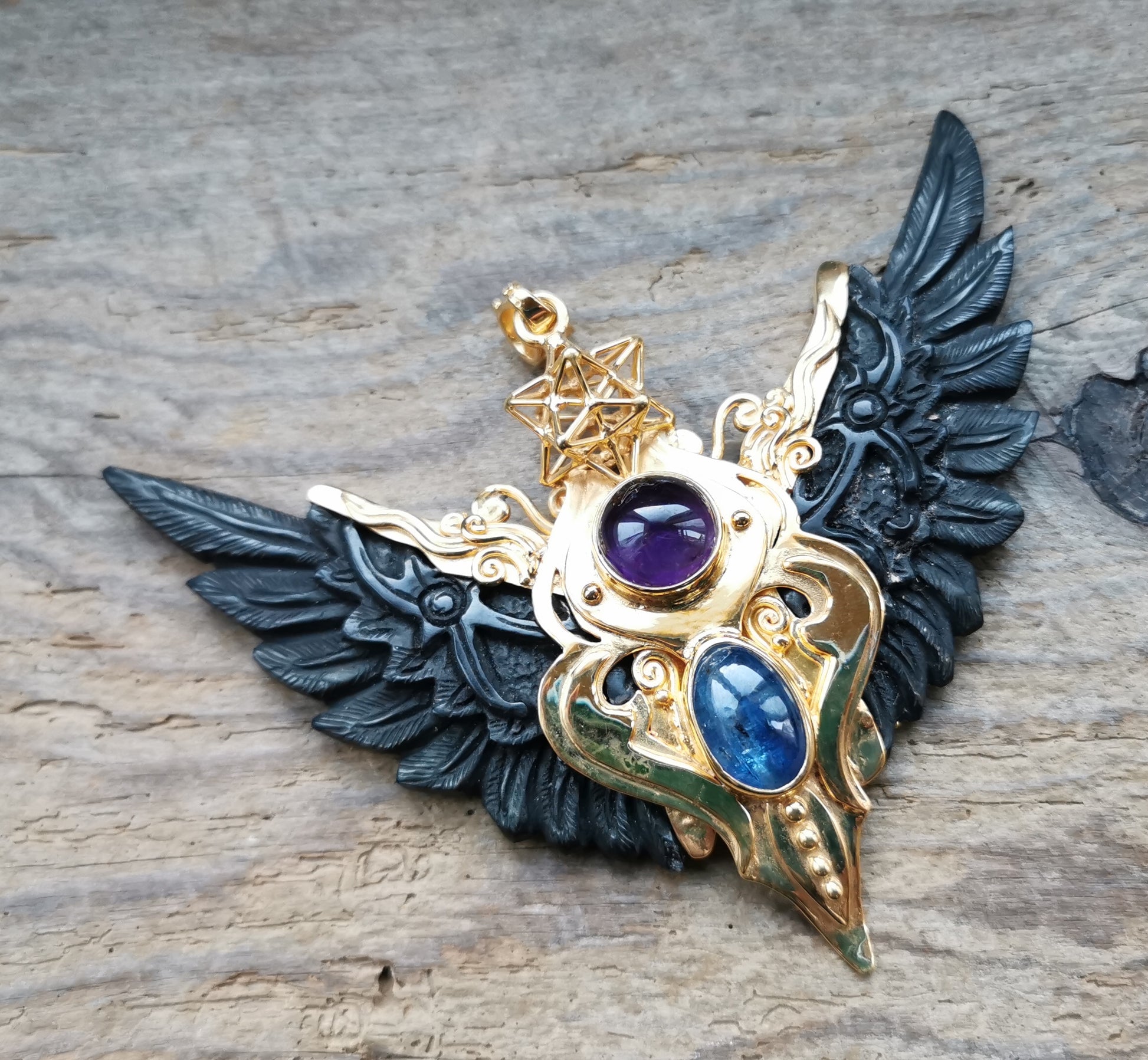 Ref.PD0968 - Gold plated on silver pendant with Solar Star geometry, ebony carved wings, kyanite, and amethyst gemstones.