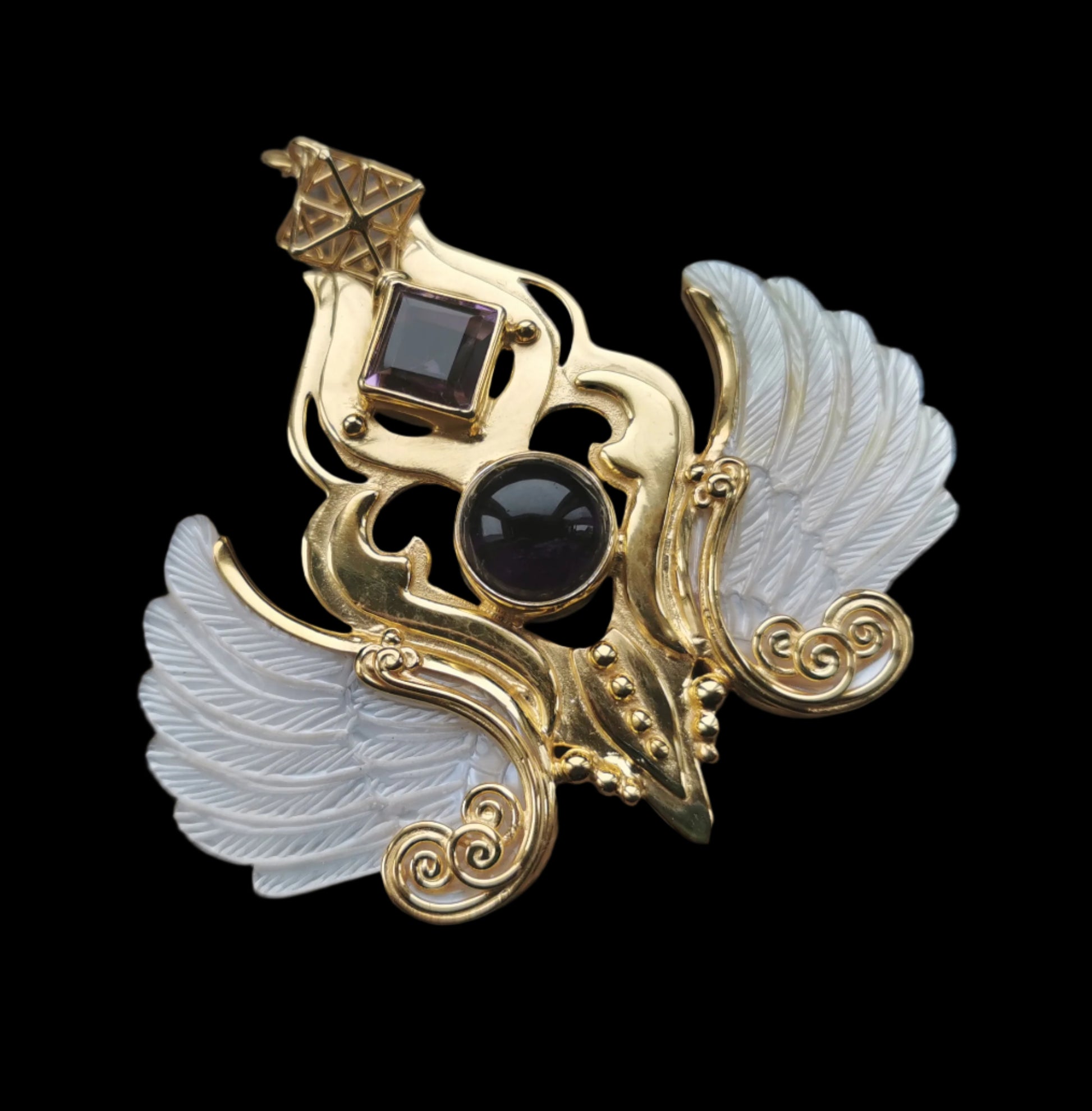 Ref.PD0979 - Golden plated on silver pendant with Tantric Star geometry, mother of pearl carved wings, and amethyst gems.