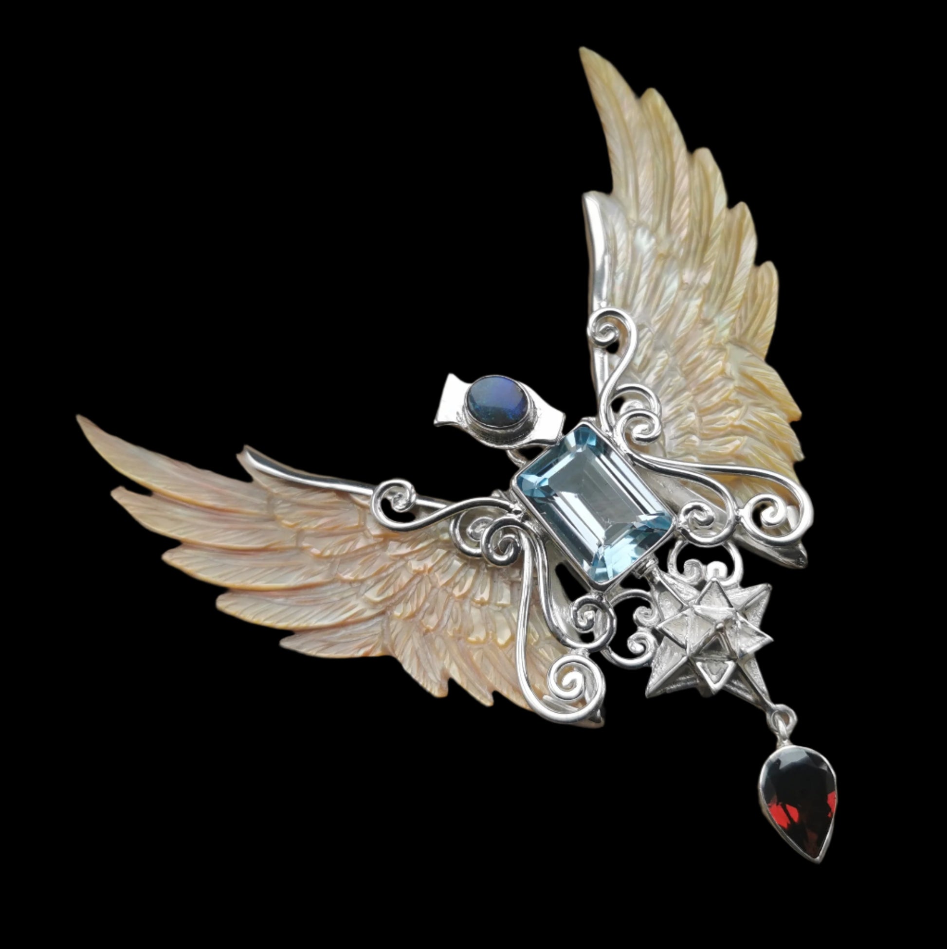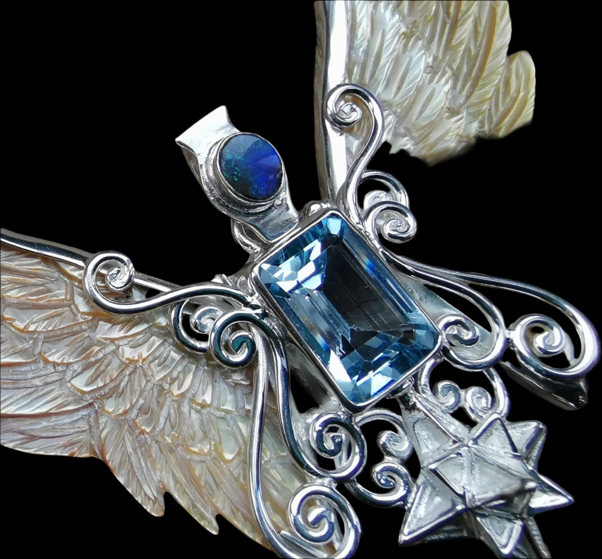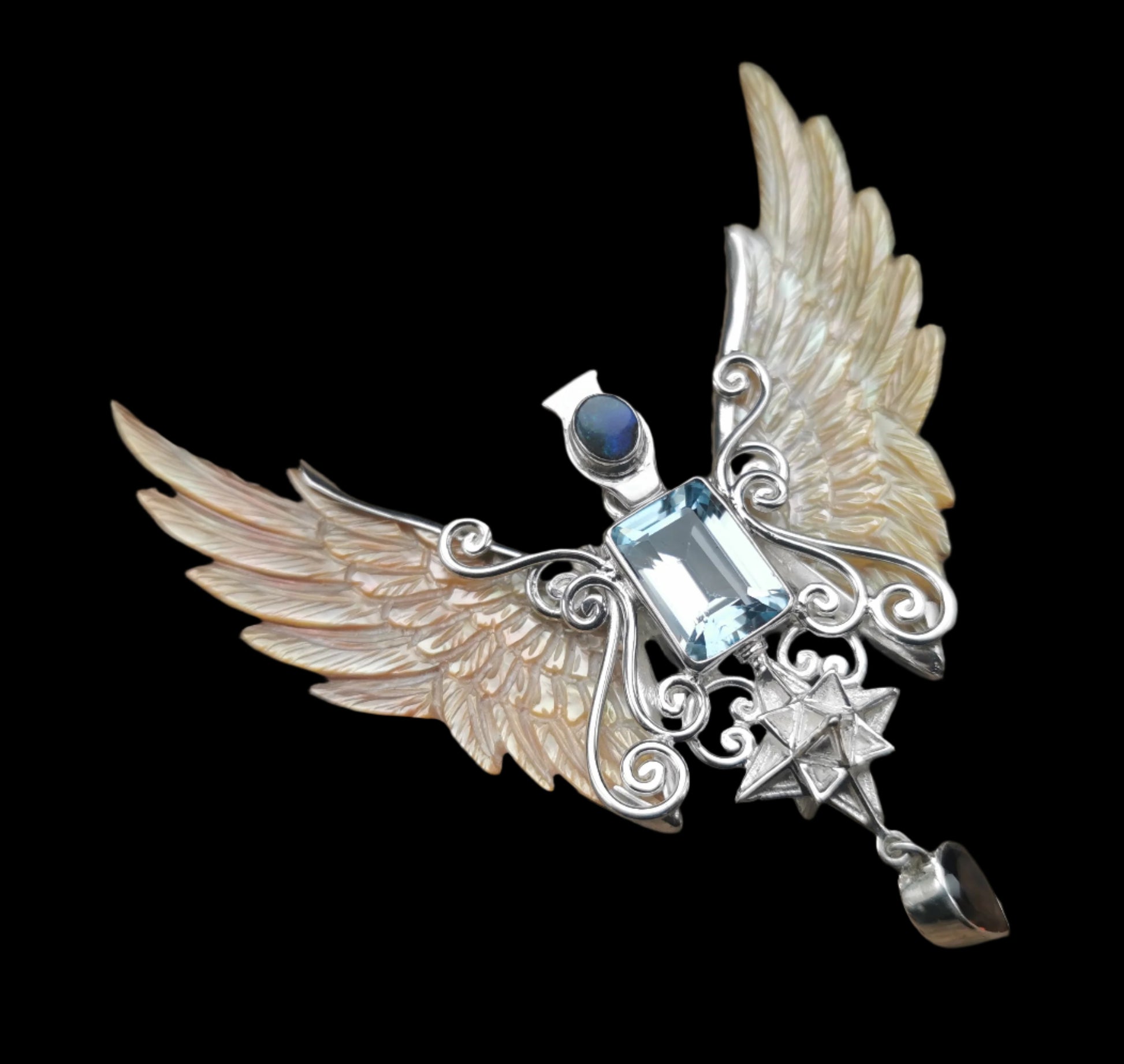 Ref.PD0981 - Silver pendant with solid Heart Star geometry, mother of pearl carved wings, opal [bale], sky blue topaz, and garnet gemstones.