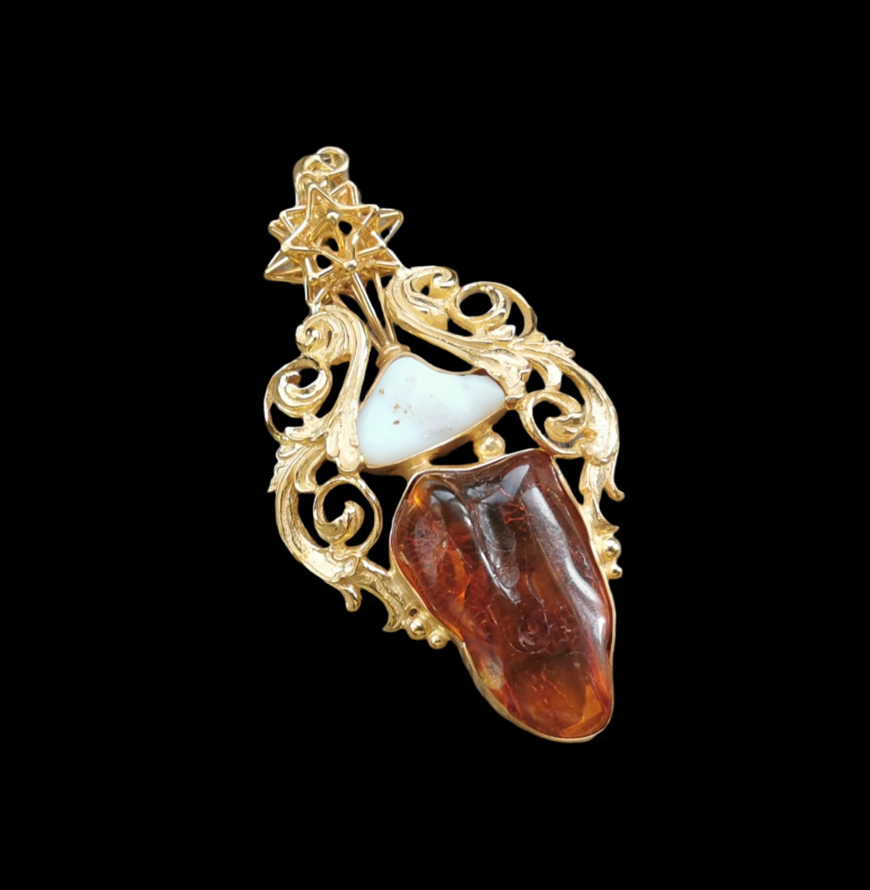Ref.PD0983 - Gold plated on silver pendant with Star Light geometry, amber, and opal gemstone.