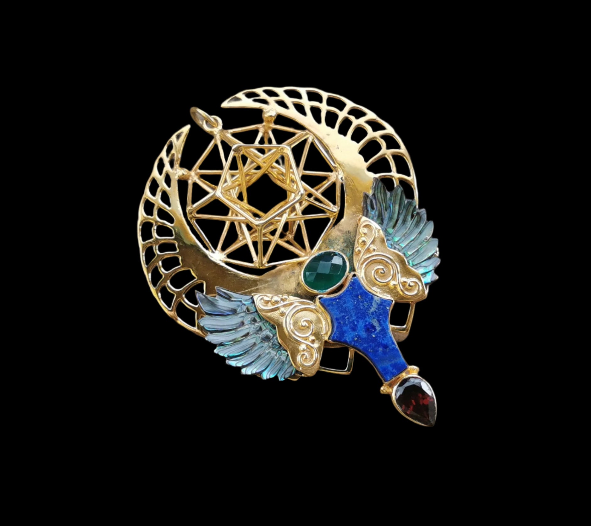 Ref.PD0985 - Gold plated on silver pendant with 5D Hyper Dodecahedron geometry, abalone shell carved wings, emerald, lapis lazuli, and garnet gemstones.