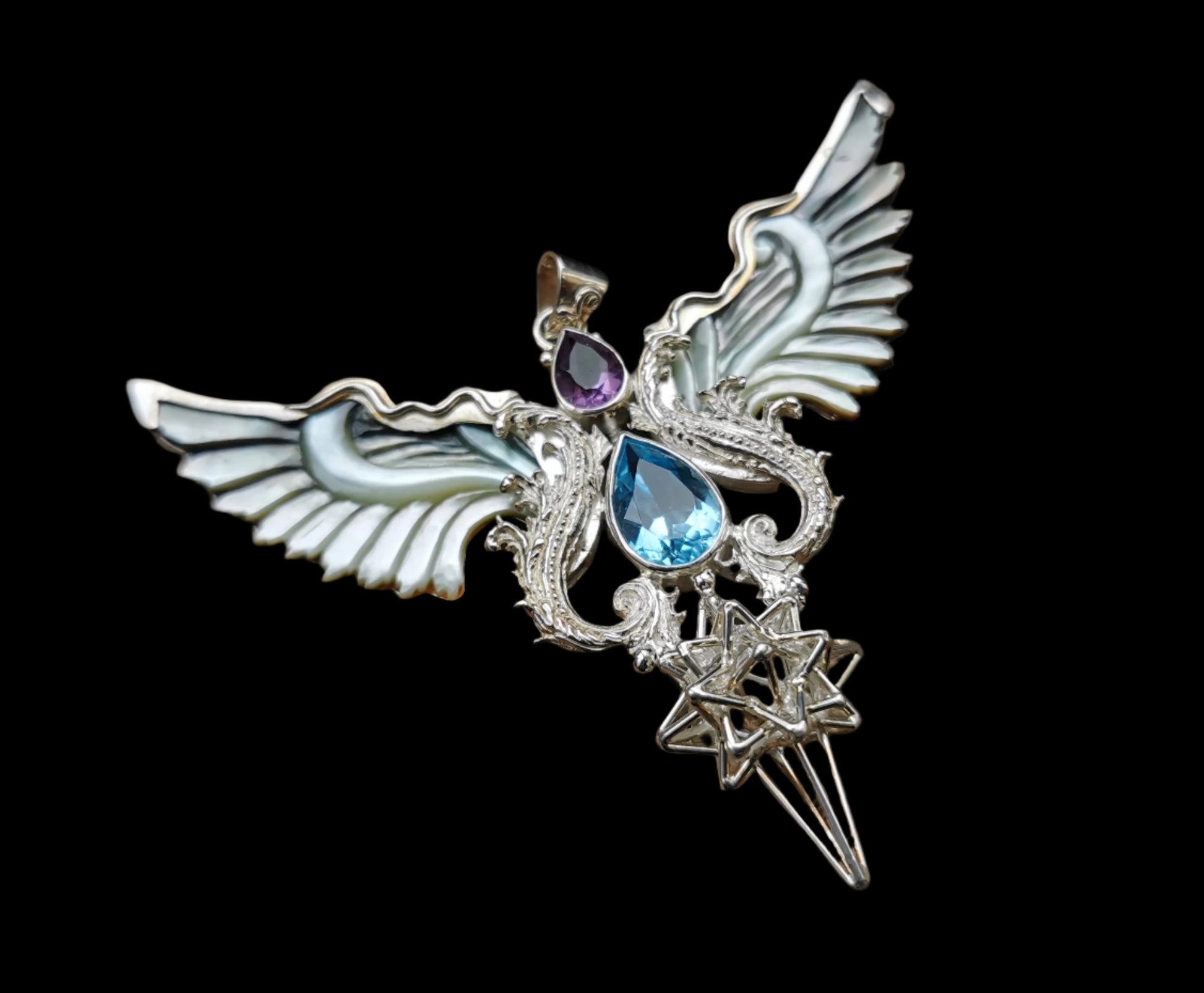 Ref.PD0986 - Silver pendant with shooting star motif, mother of pearl carved wings, amethyst, and sky blue topaz gems.
