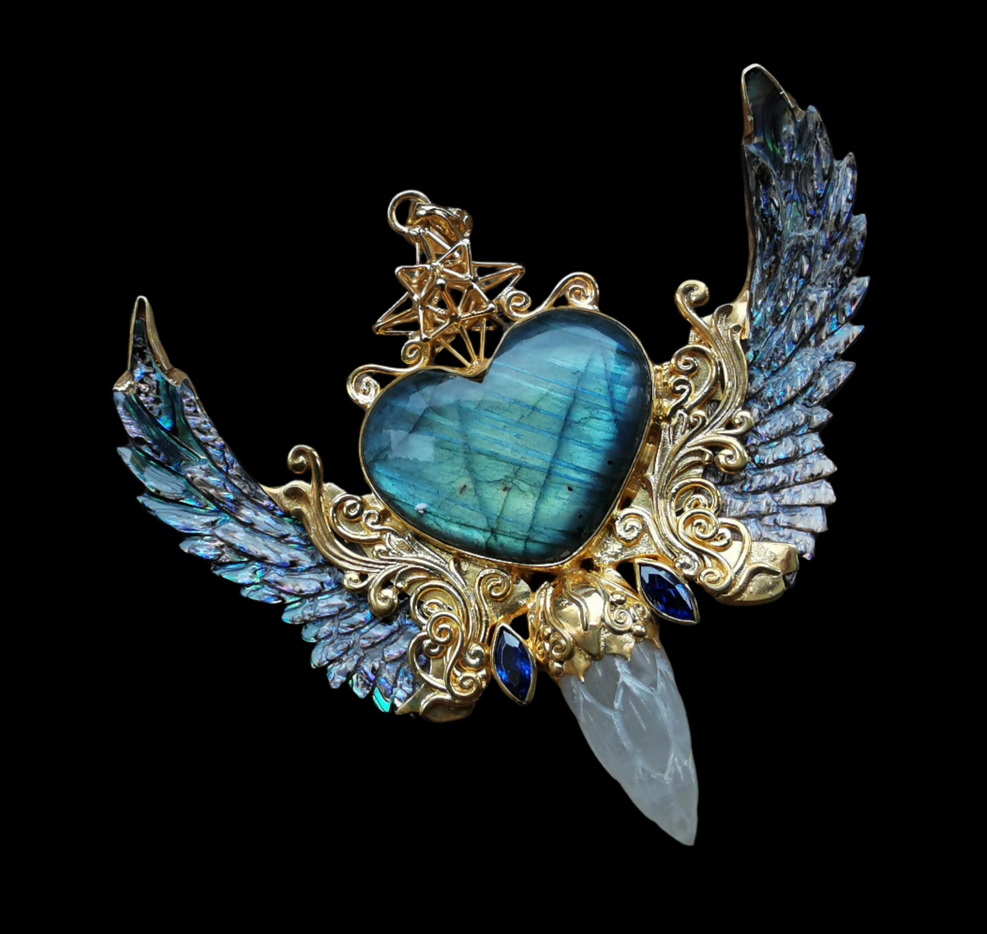 Ref.PD0991 - Gold plated on silver pendant with Heart Star geometry, abalone carved wings, heart carved labradorite, sapphire, and selenite gemstones.