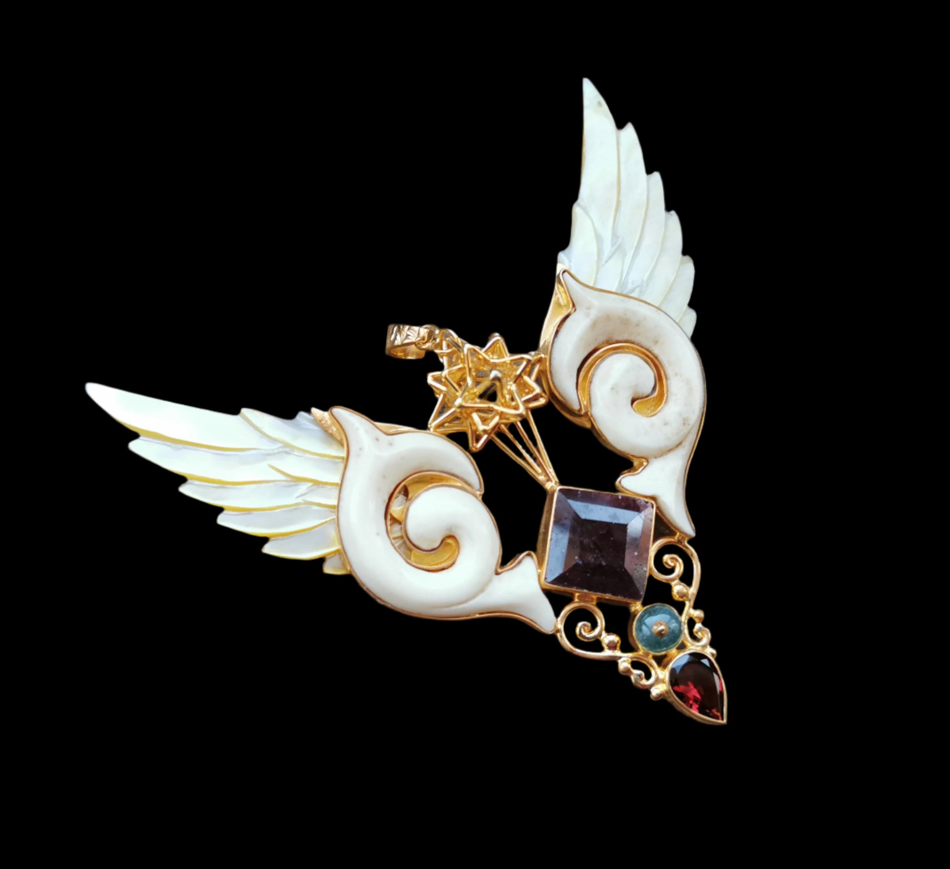 Ref.PD0994 - Gold plated on silver pendant with shooting star, mother of pearl carved wings, ecologically sourced deer horn carved cloud, ruby, turquoise, and garnet gemstones.