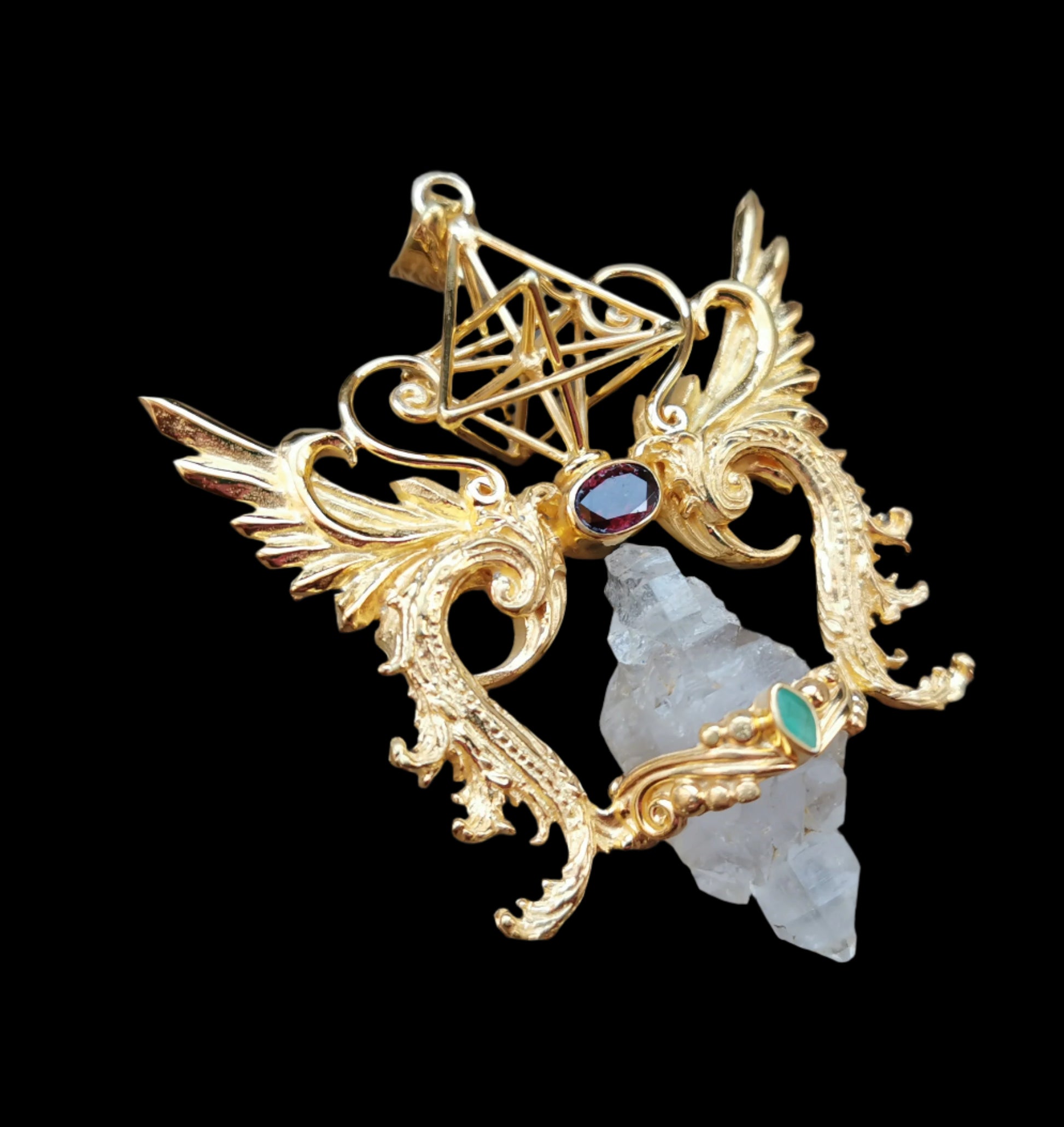 Ref.PD0995 - Gold plated on silver pendant with Hyper Tetrahedron geometry & wings, quartz crystal, garnet, and emerald gemstones.