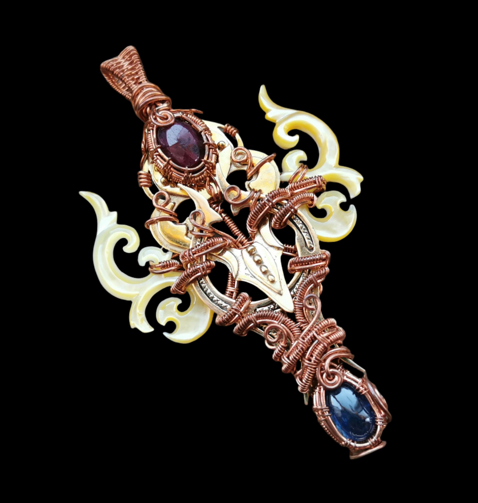 Ref.PD0997 - Wire wrap pendant with mother of pearl carved Tibetan clouds, ruby, and kyanite gemstones.