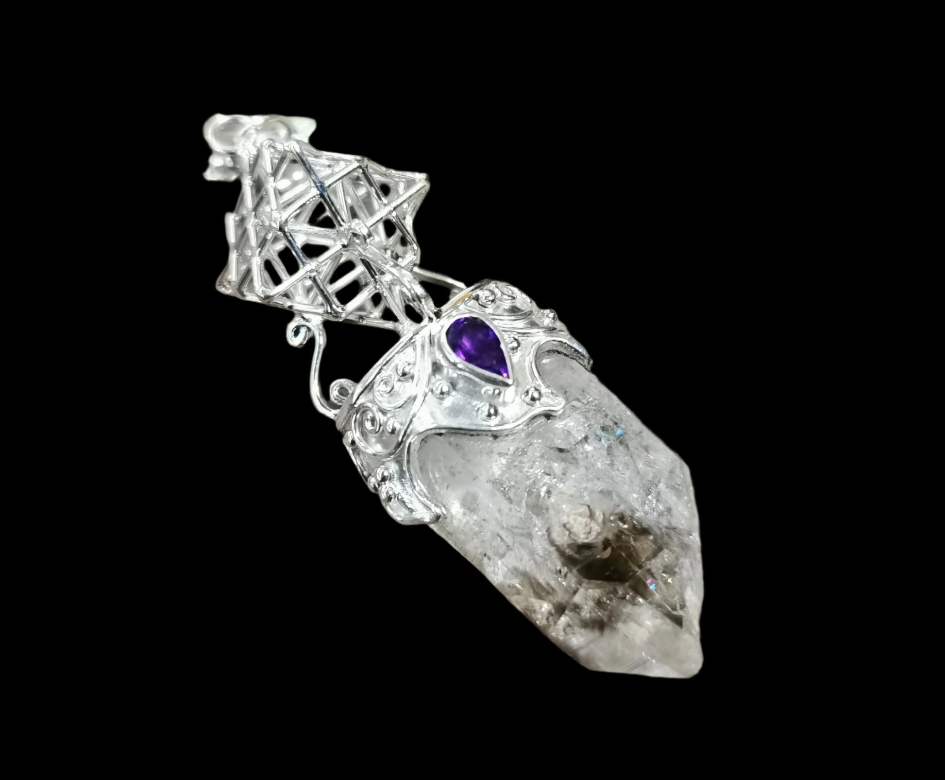 Ref.PD0999 - Silver pendant with Tantric Terra Prana geometry, twin laser quartz crystal, amethyst, and moonstone [bale] gemstones.