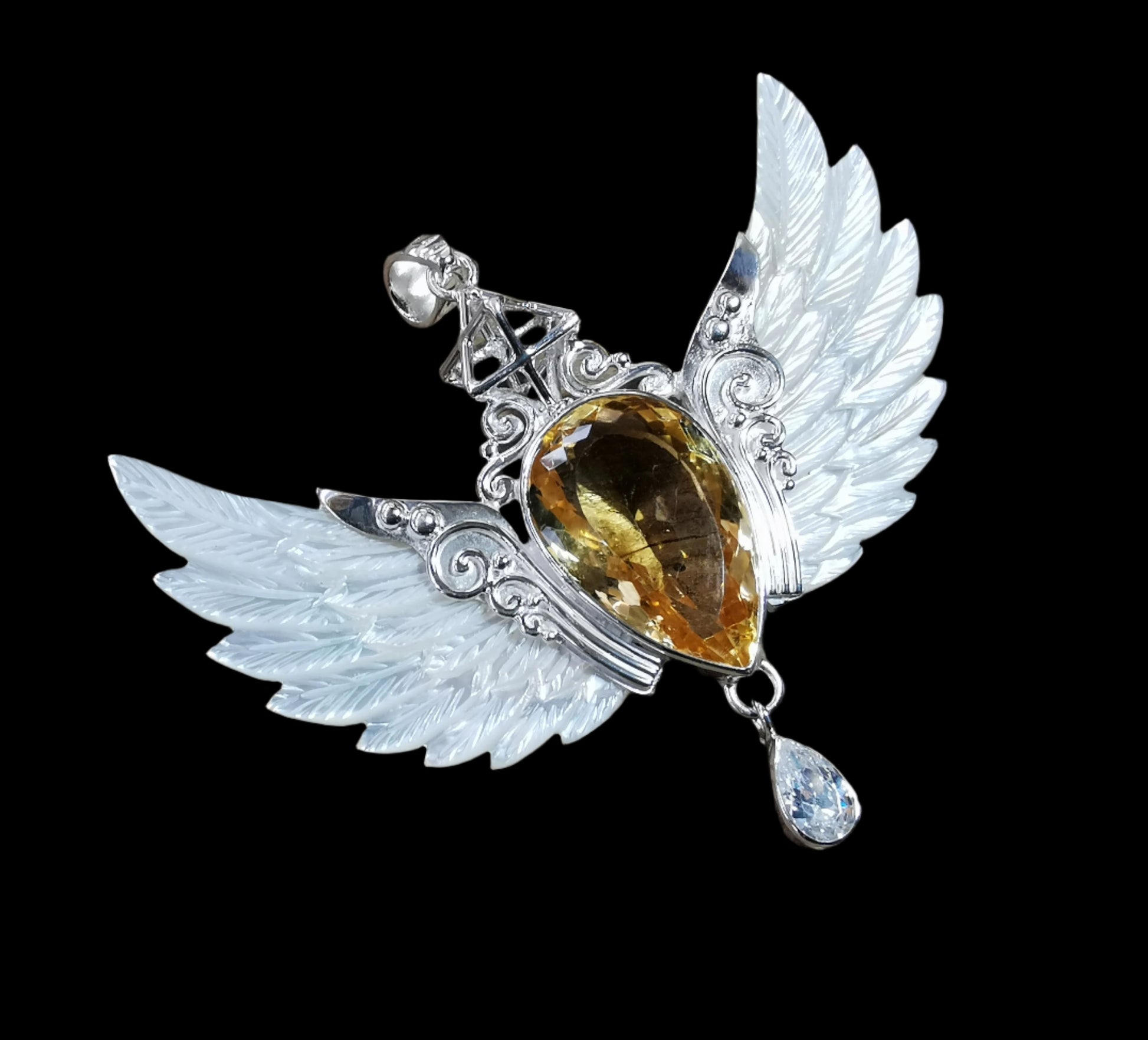 Ref.PD1001 - Silver pendant with Star Tetrahedron geometry, mother of pearl carved wings, quartz crystal, and citrine gemstone.