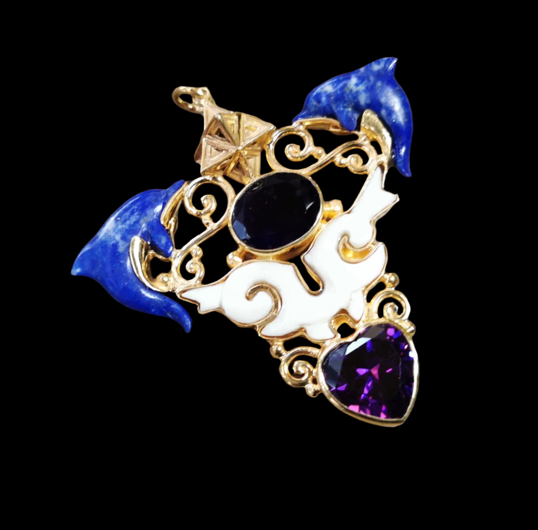 Ref.PD1003 - Golden plated on silver pendant with solid Tantric Star geometry, ecologically sourced deer horn carved wave, lapis lazuli carved dolphins, and amethyst gemstones.