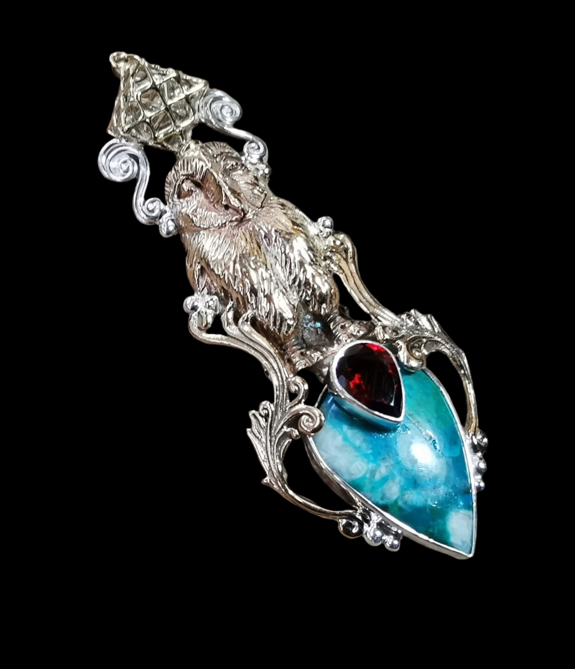 Ref.PD1005 - Silver pendant with Tantric Terra Prana geometry & owl in brass, garnet, and chrysocolla gemstones.