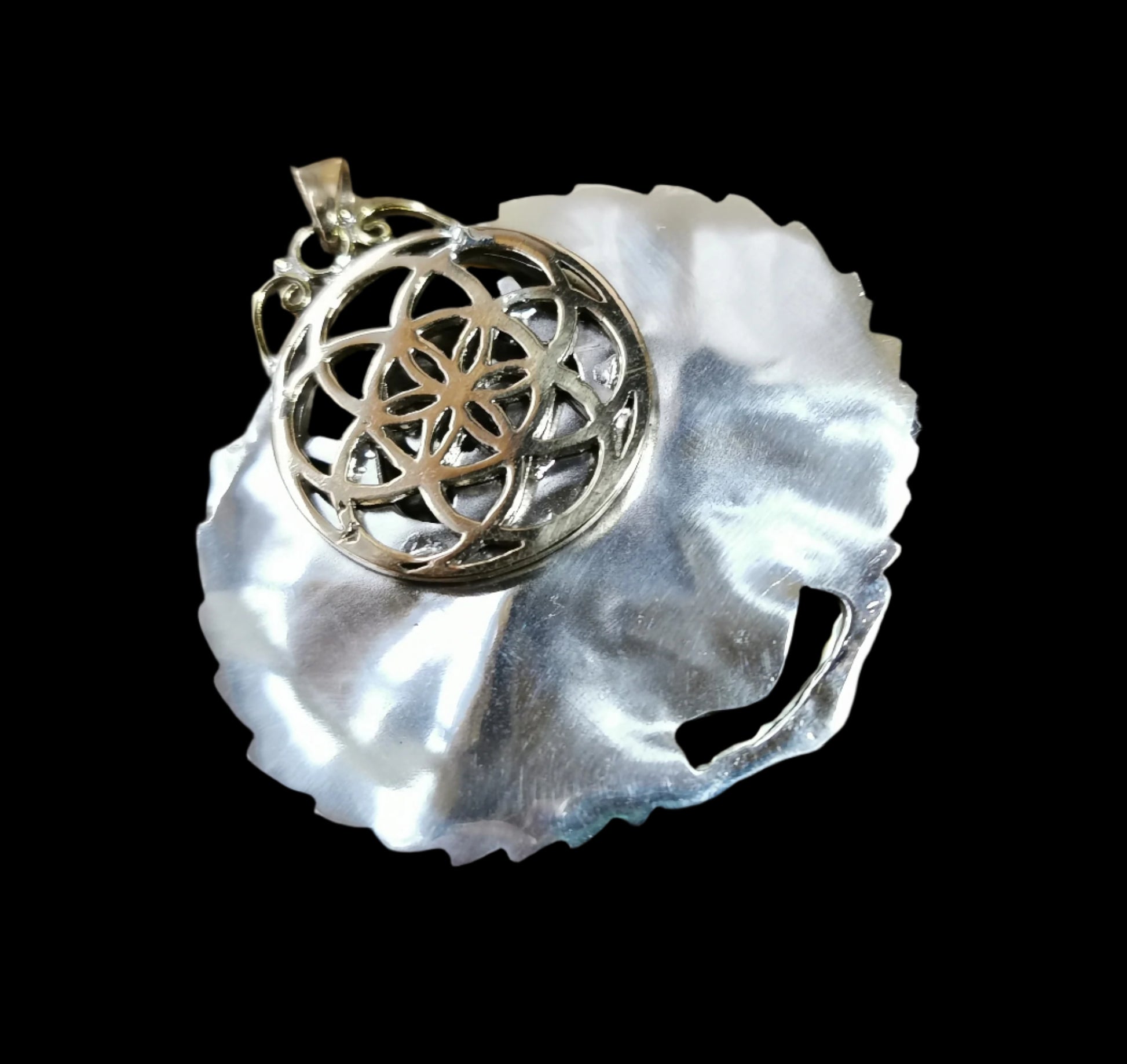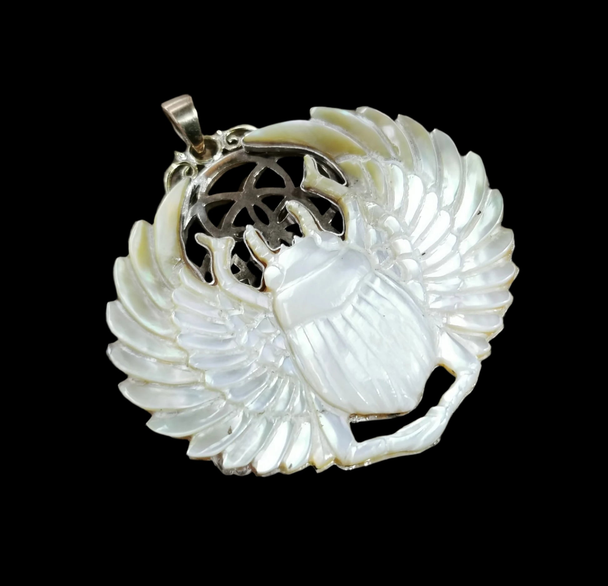 Ref.PD1006- Silver/brass pendant with Solar Mandala geometry and mother of pearl carved scarab.