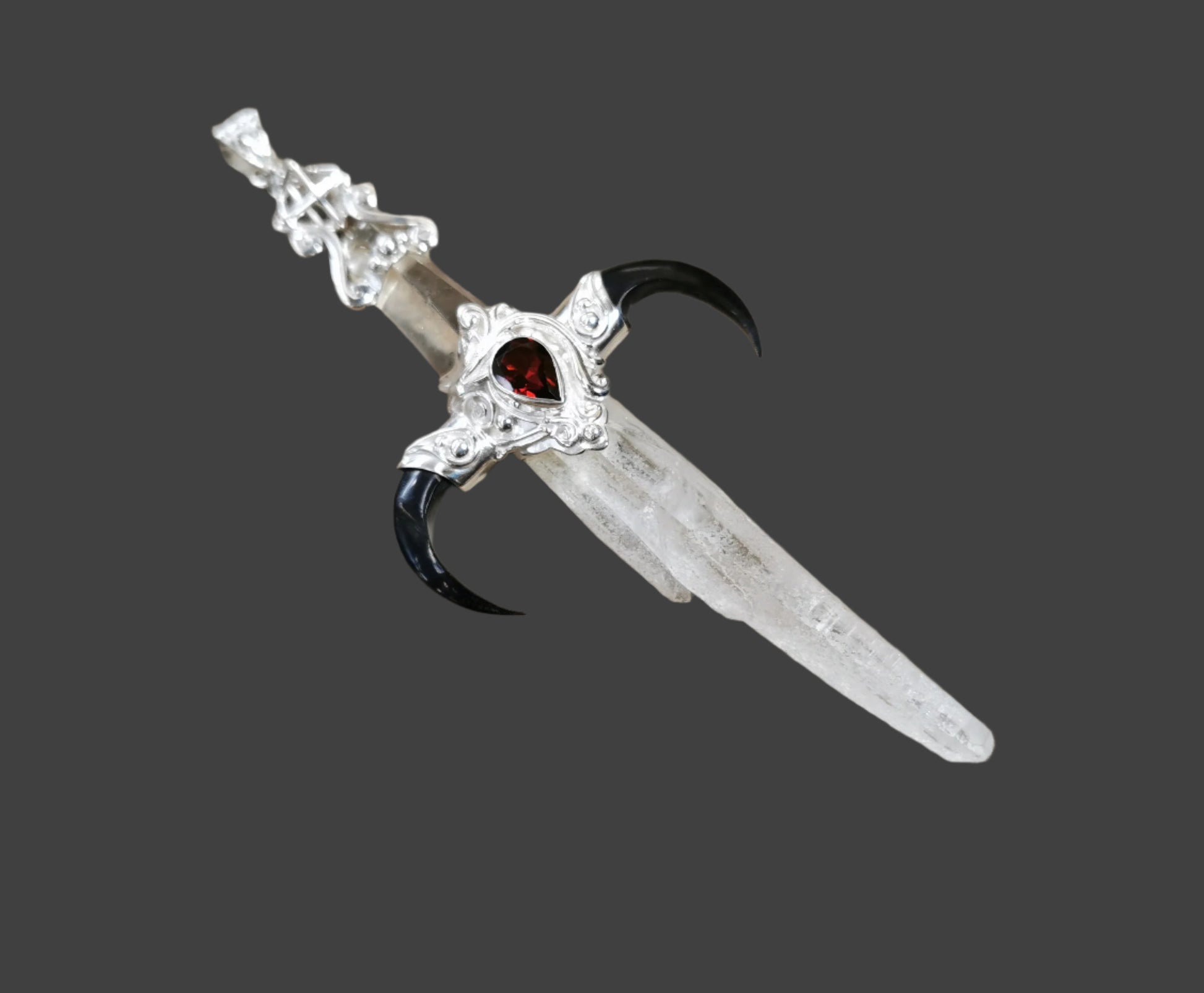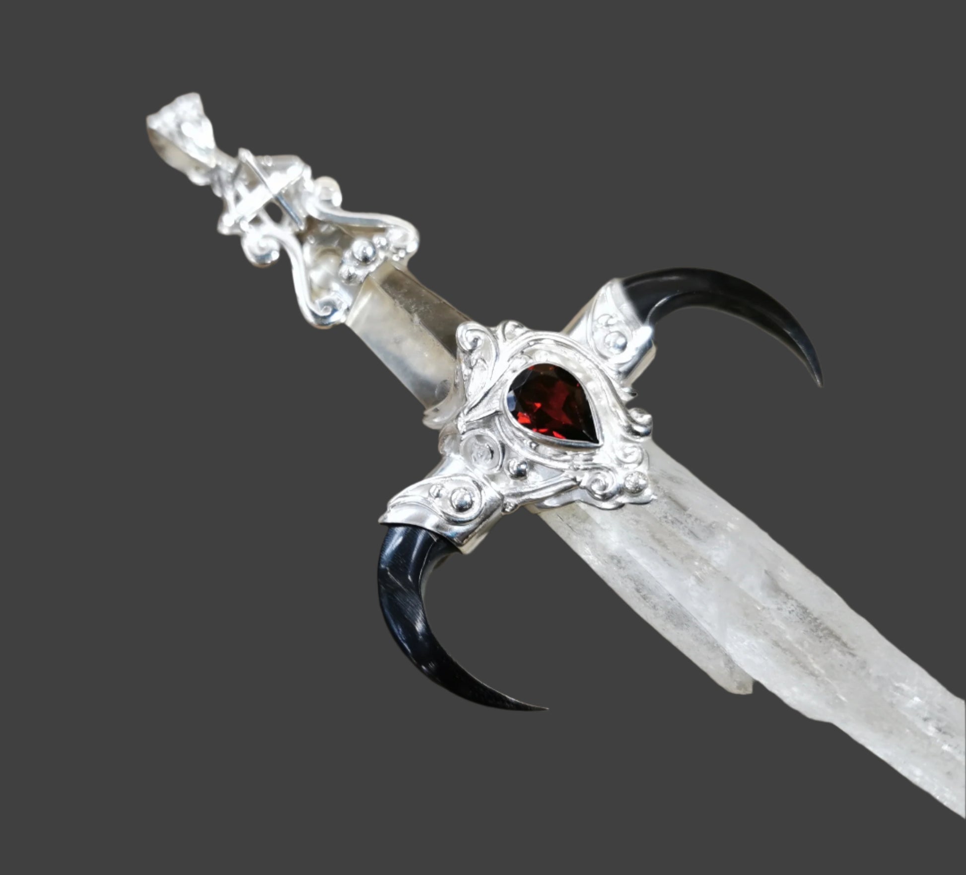 Ref.PD1009 - Silver pendant with Star Tetrahedron geometry, ecologically sourced buffalo horn carved guards, clear quartz crystal, laser quartz crystal, and garnet gemstone.