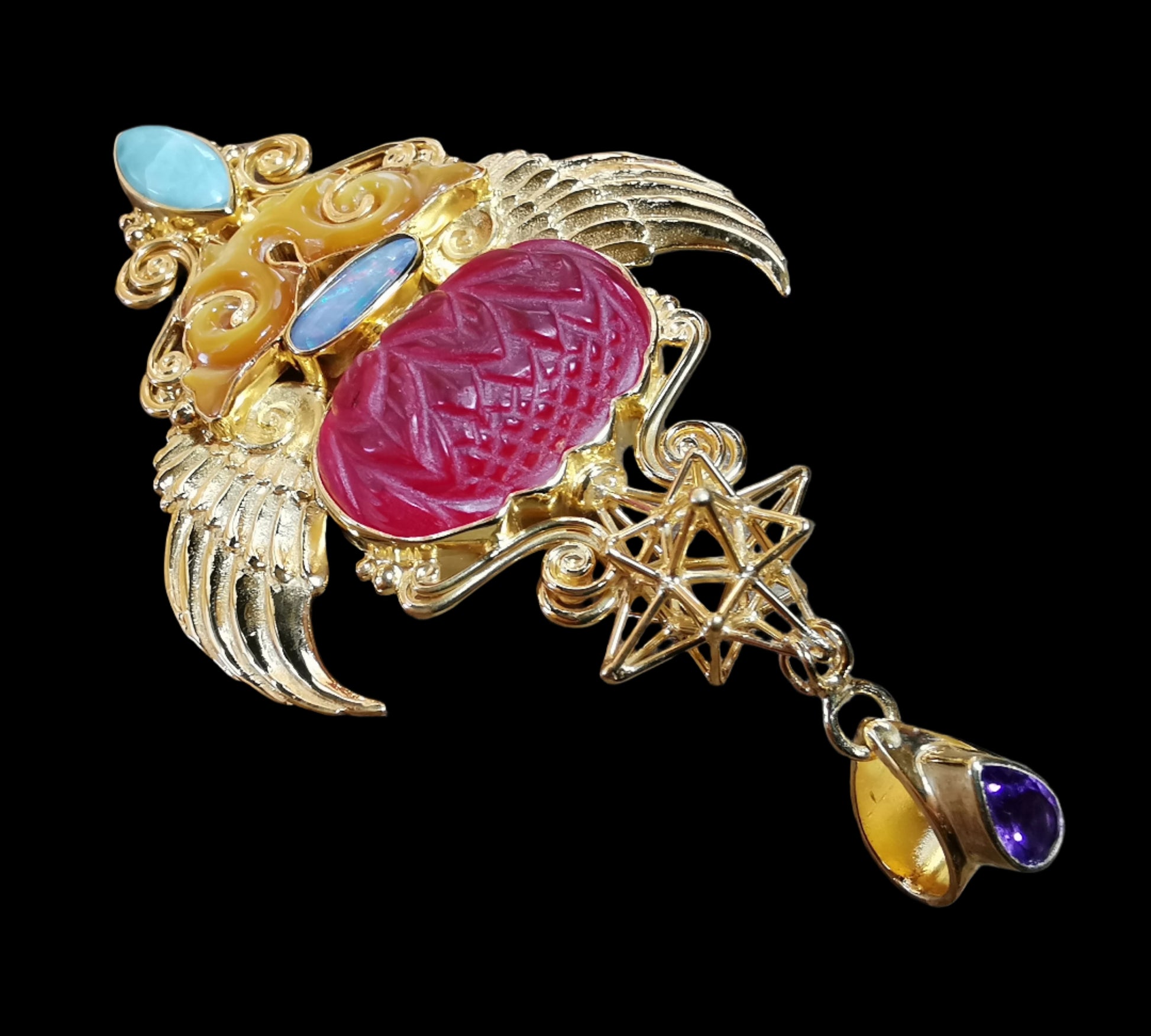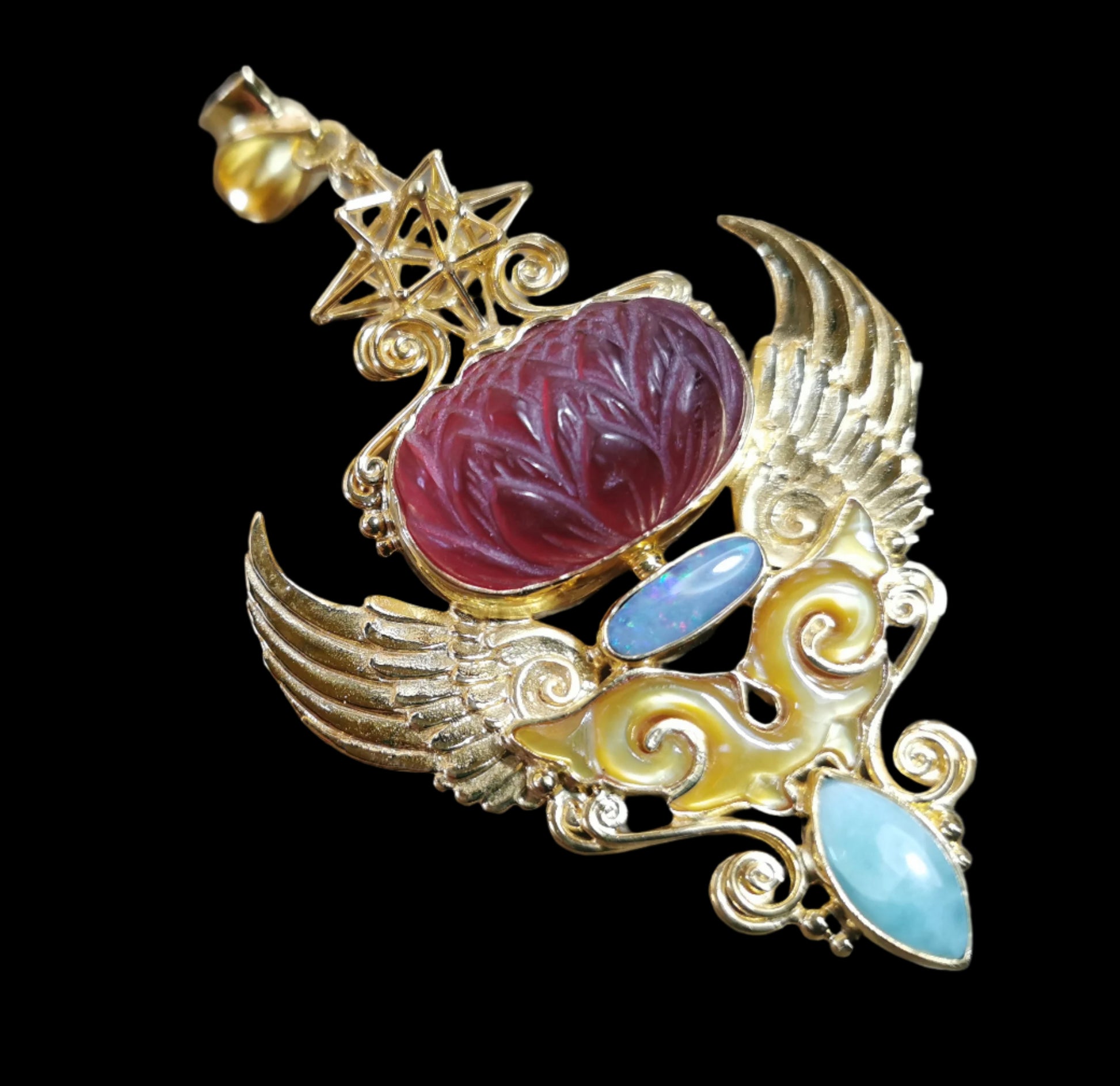 Ref.PD1011 - Gold plated on silver pendant with Heart Star geometry, mother of pearl carved leaves, ruby carved lotus flower, opal, larimar, and amethyst [bale] gemstones.