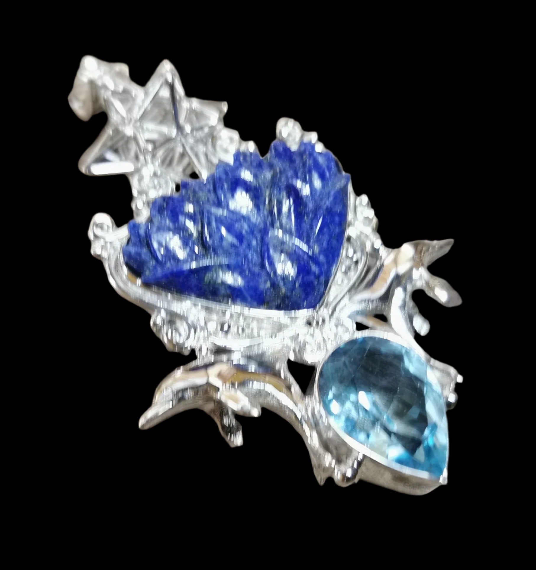 Ref.PD1013 - Silver pendant with Heart Star geometry & dolphins, lapis lazuli carved lotus flower, and Swiss blue topaz gemstones.
