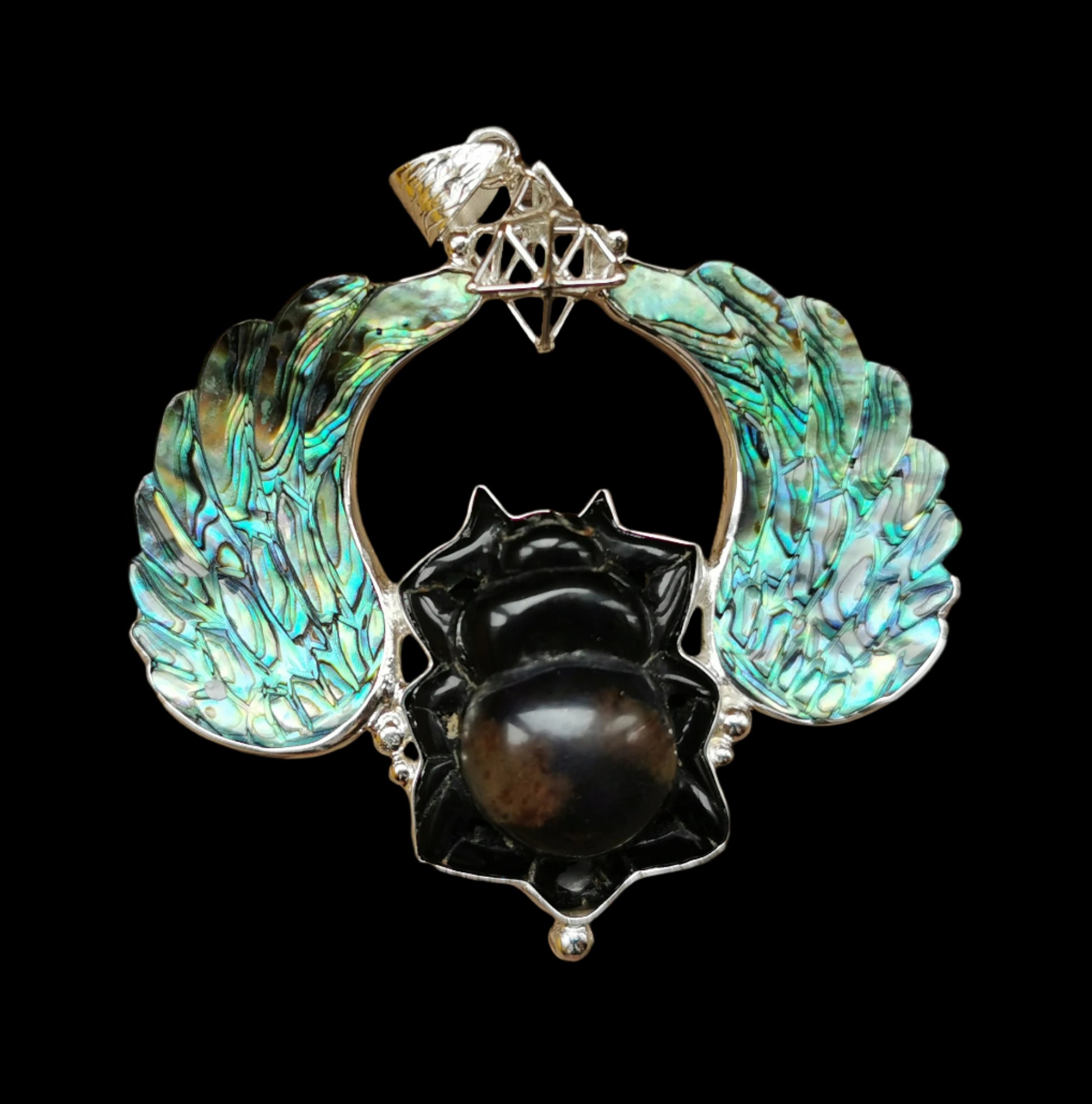 Ref.PD1014 - Silver pendant with Tantric Star geometry, abalone carved wings, scarab carved in amber & iron wood.