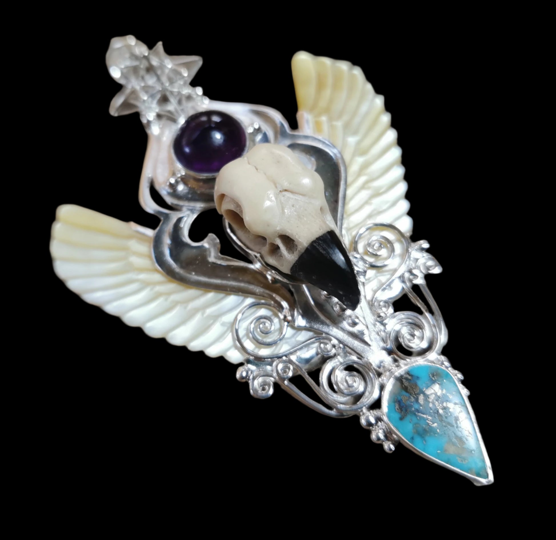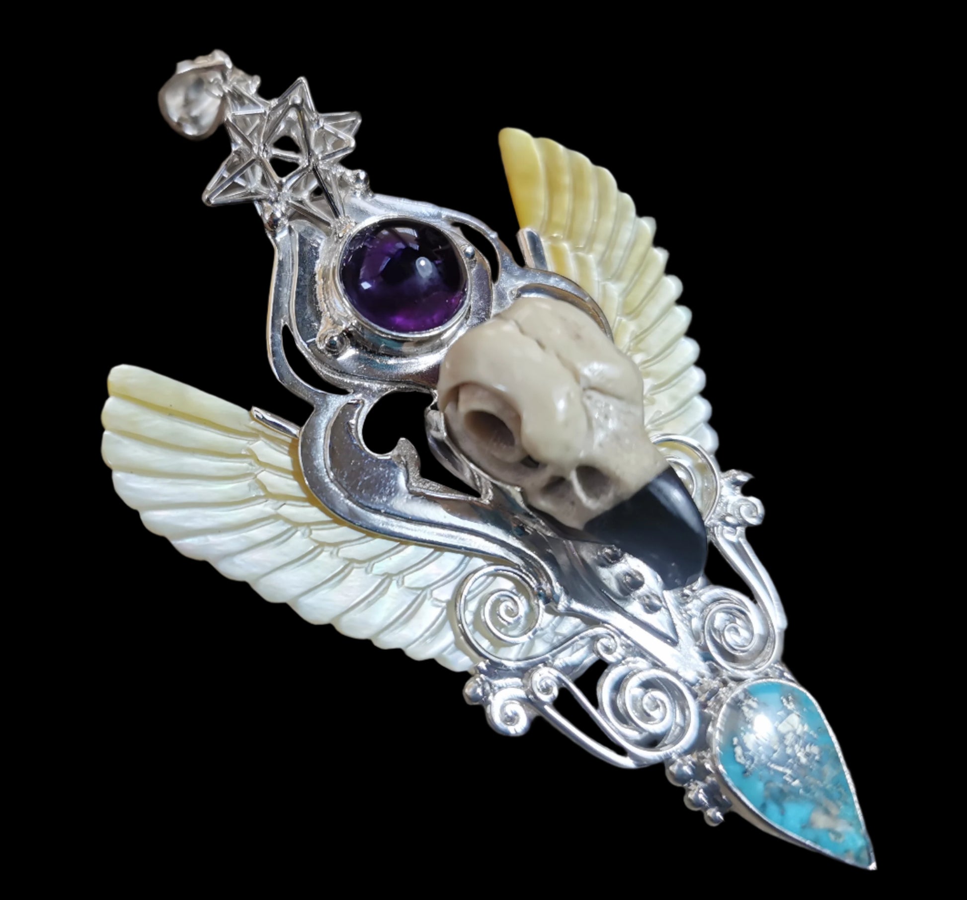 Ref.PD1015 - Silver pendant with Heart Star geometry, mother of pearl carved wings, ecologically sourced deer horn carved eagle, turquoise, and amethyst gemstones.