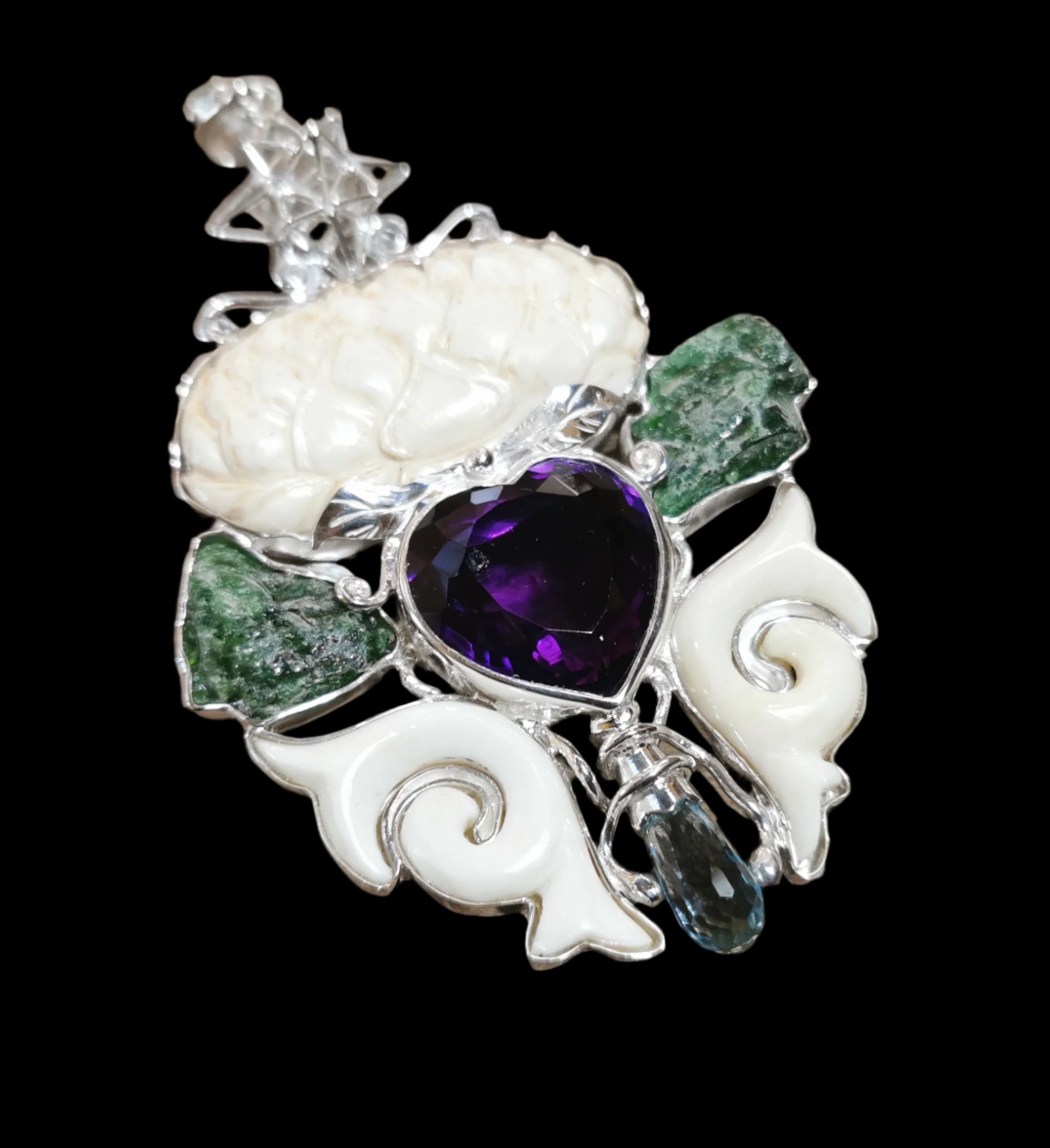 Ref.PD1018 - Silver pendant with Heart Star geometry, mammoth carved lotus flower, ecologically sourced deer horn carved leaves, sky blue topaz, amethyst, and dioptase gemstones.