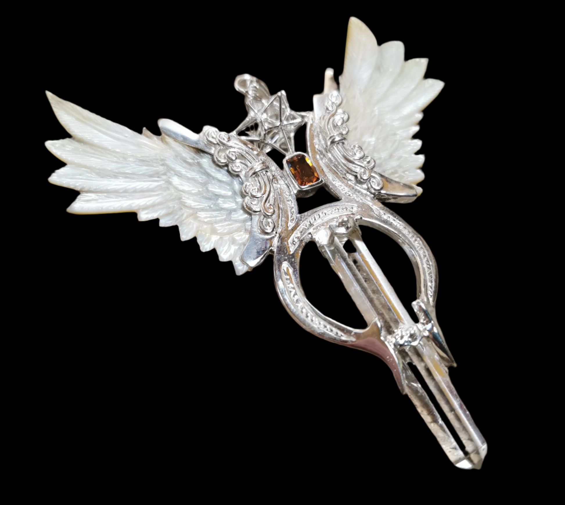 Ref.PD1019 - Silver pendant with Heart Star geometry, mother of pearl carved wings, clear quartz crystal, and citrine gemstone.