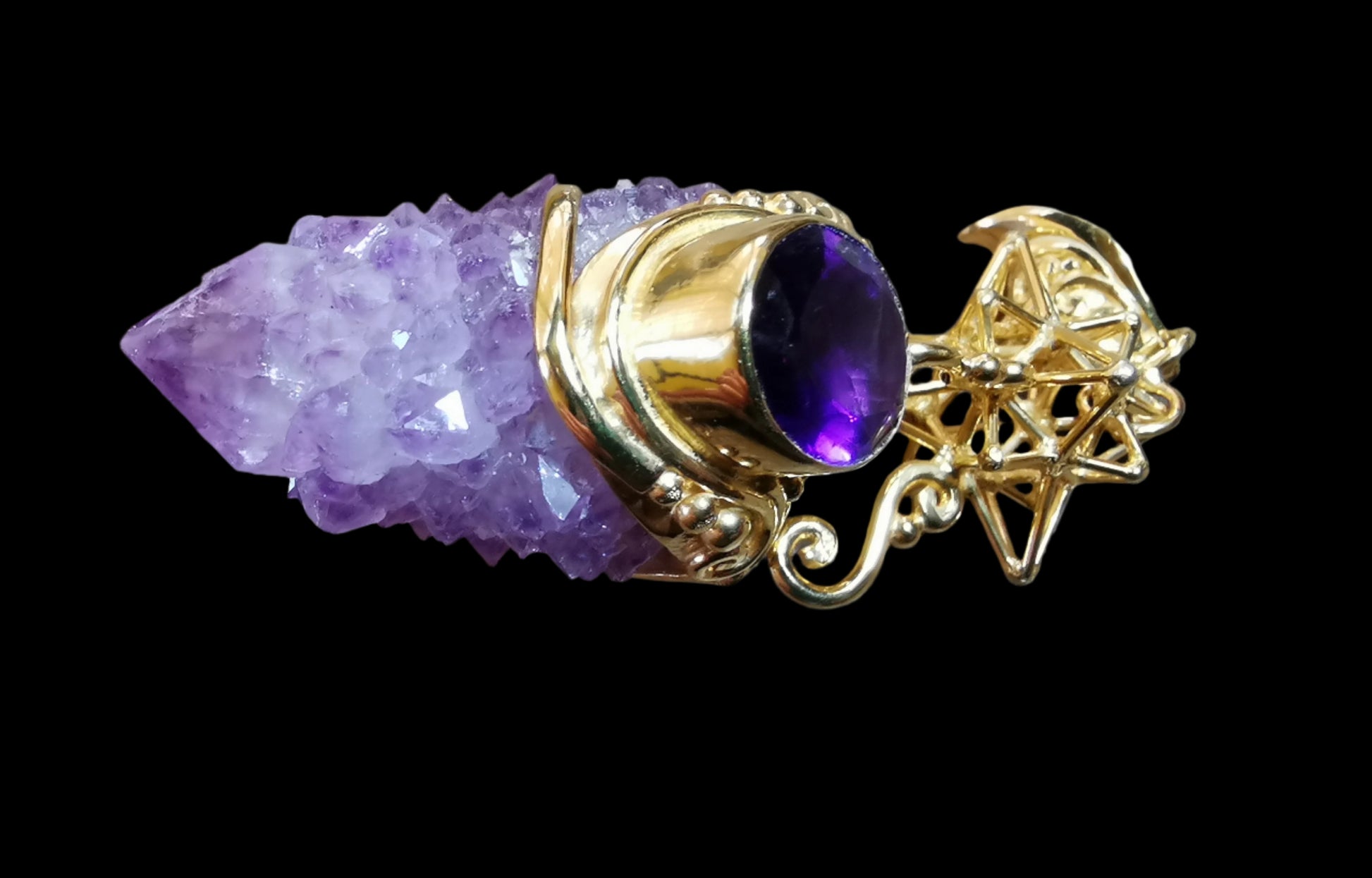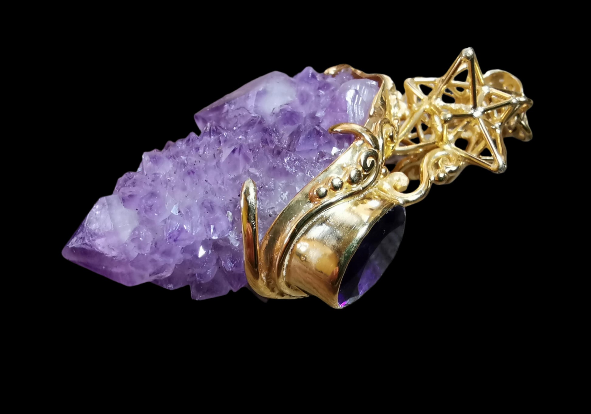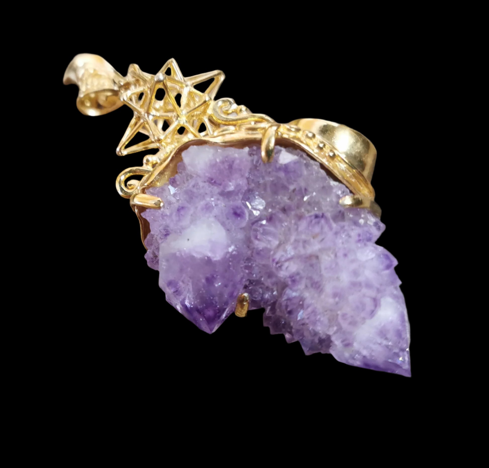 Ref.PD1021 - Gold plated on silver pendant with Heart Star geometry, amethyst, and spirit quartz amethyst gemstones.