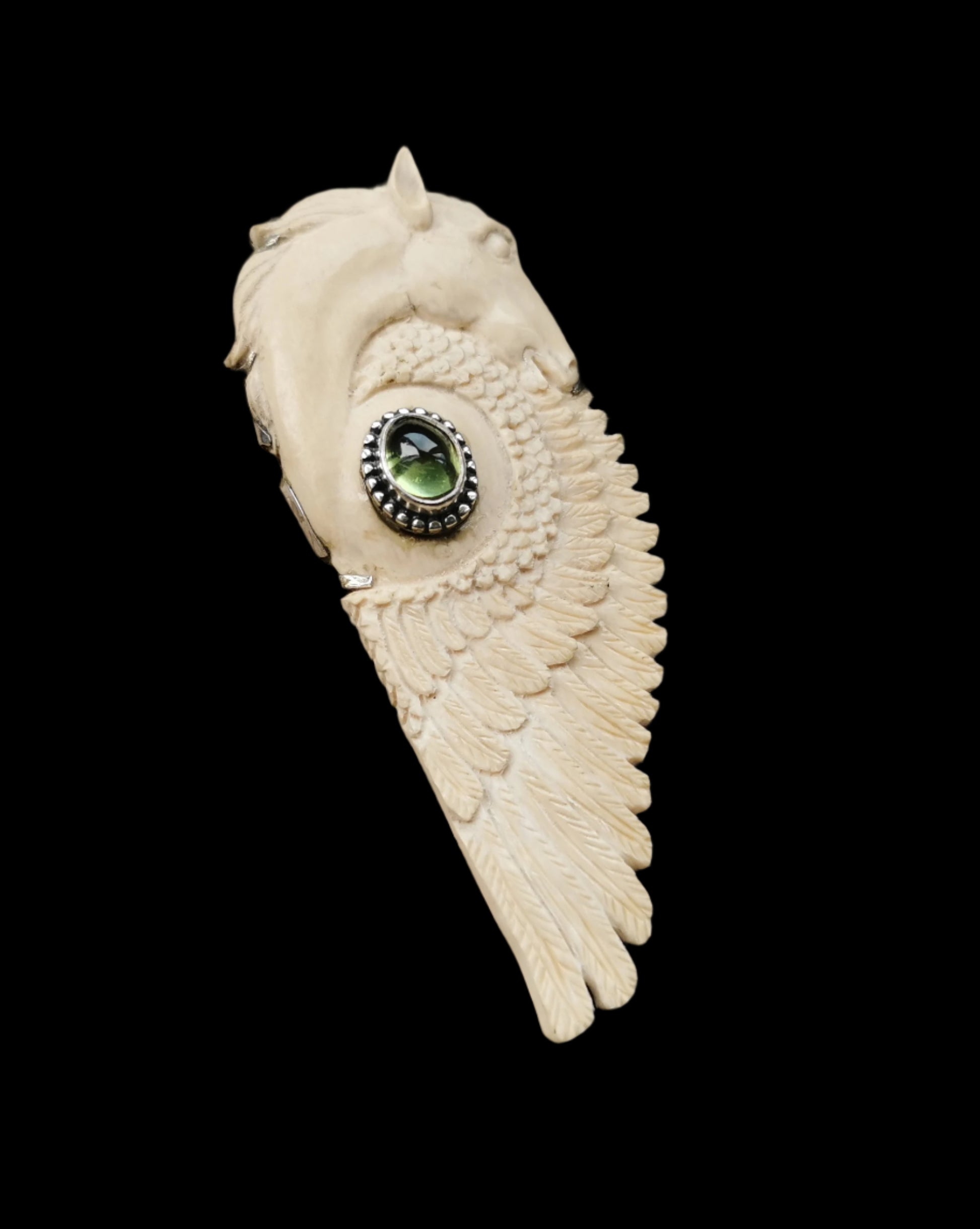 Ref.PD1027 - Silver pendant with mammoth carved horse with wings, and peridot gemstone.