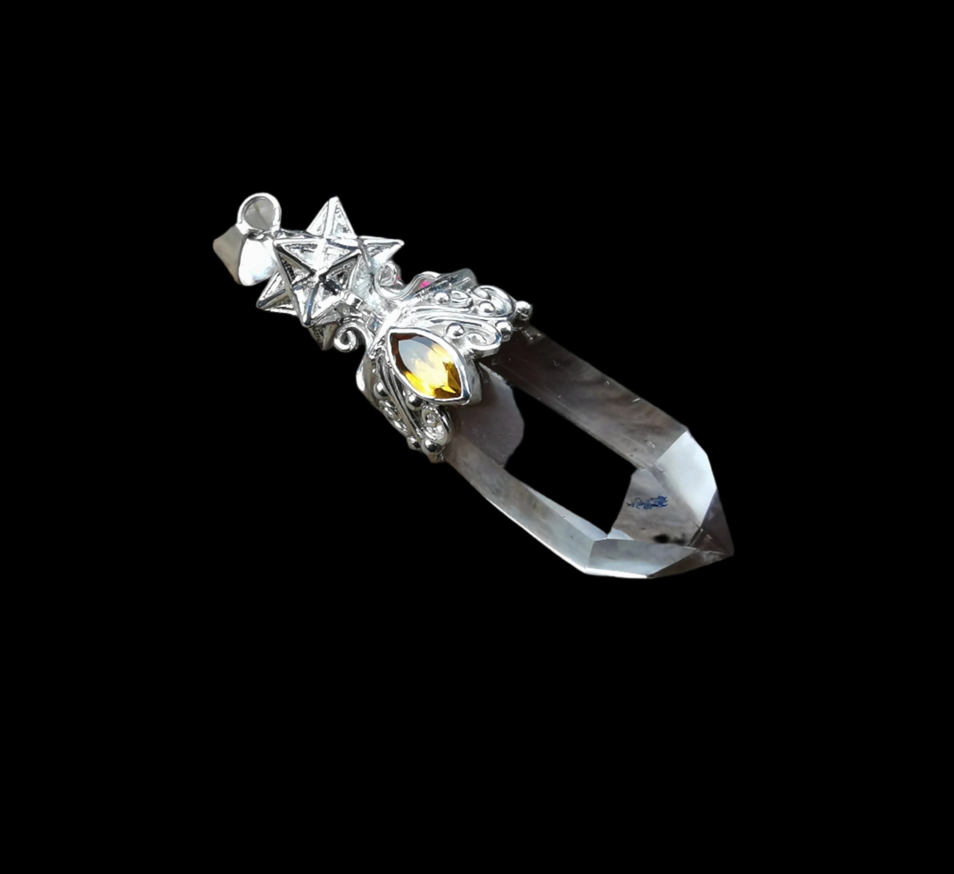 Ref.PD1028 - Silver pendant with solid Solar Star geometry, clear quartz crystal, and citrine gemstone.