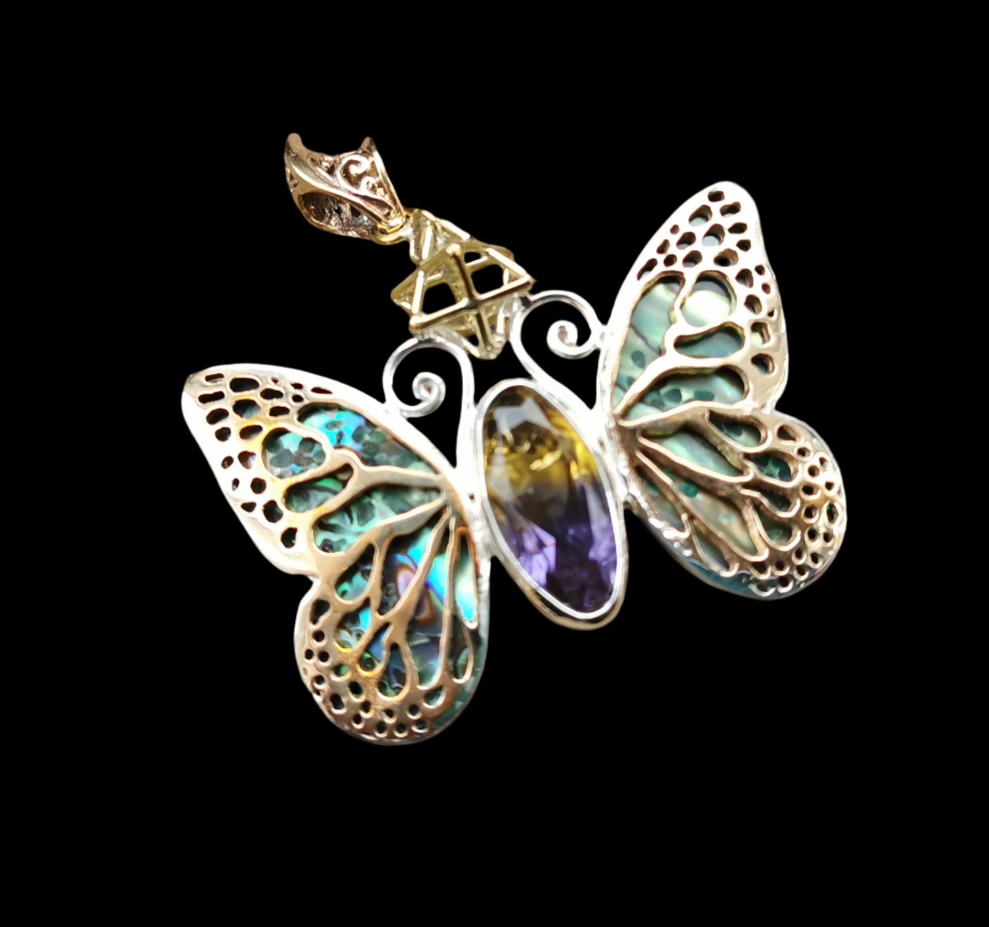 Ref.PD1029 - Pendant with brass Tantric Star geometry, abalone & silver butterfly wings, and ametrine gemstone.