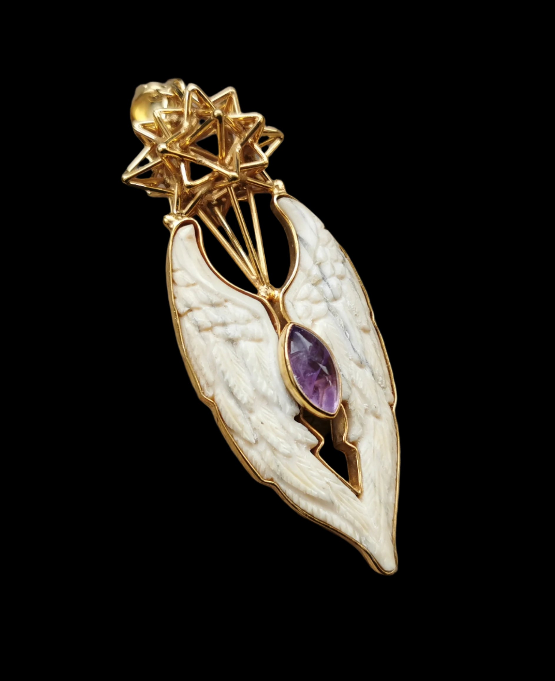 Ref.PD1031 - Gold plated on silver pendant with Star Light motif, mammoth carved wings, and amethyst gemstone.