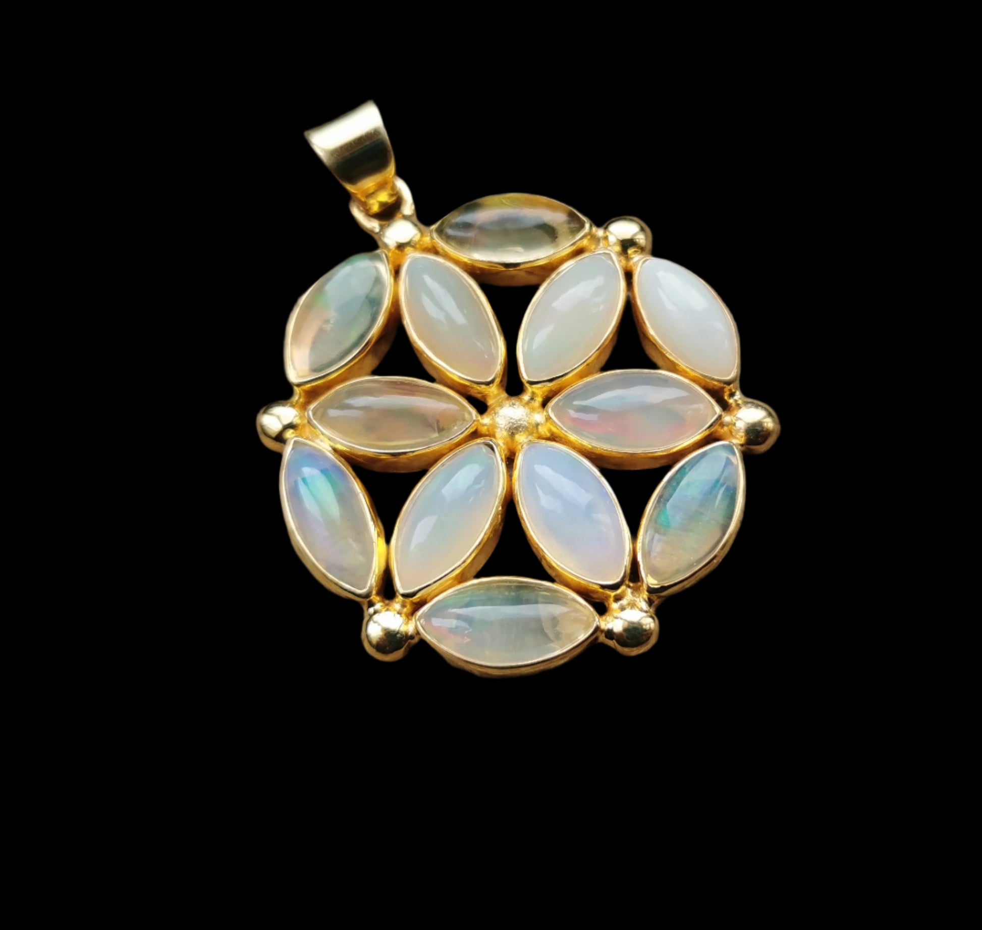 Ref.PD1032 - Gold plated on silver pendant with opal gems depicting a Solar Mandala geometry.