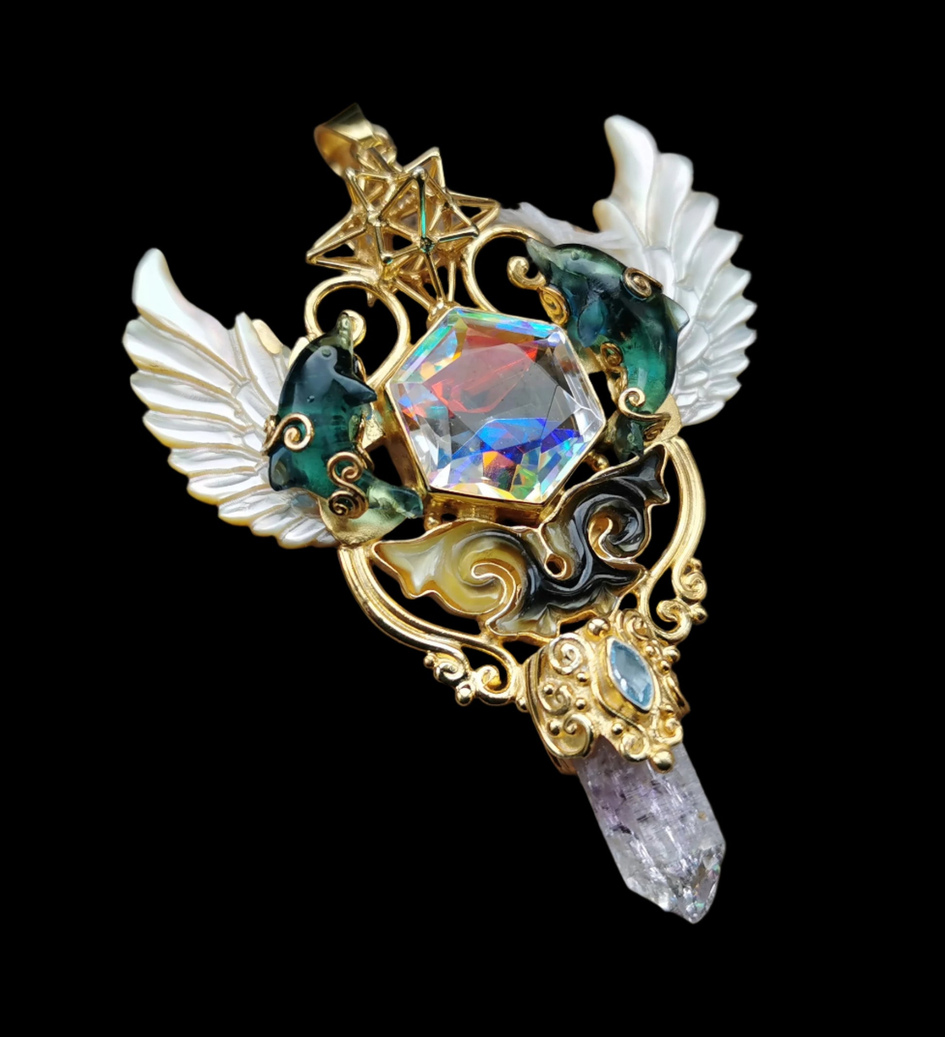 Ref.PD1033 - Gold plated on silver pendant with Heart Star geometry, mother of pearl carved wings & clouds, dolphins, mystic quartz, sky blue topaz, and amethyst gemstones.