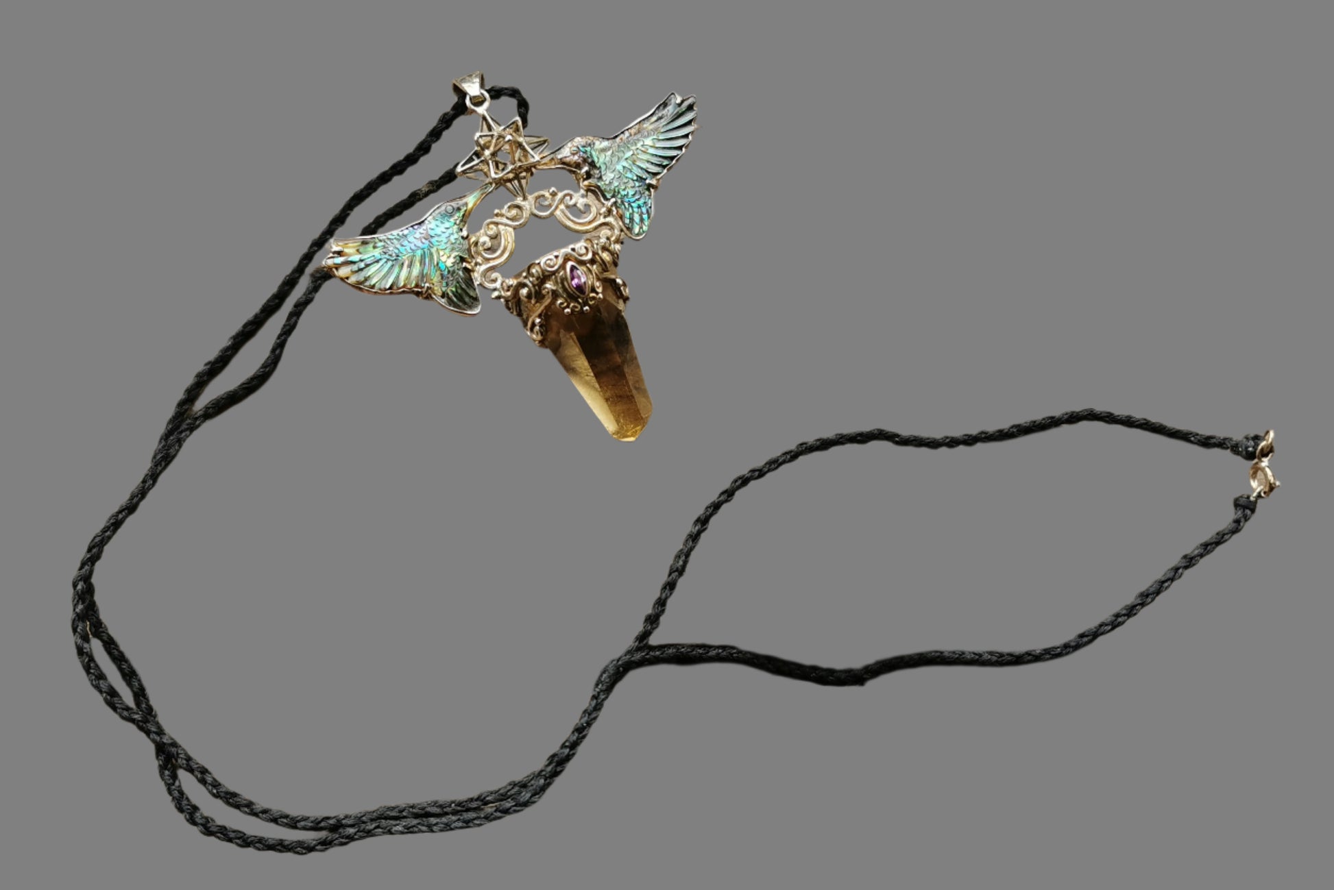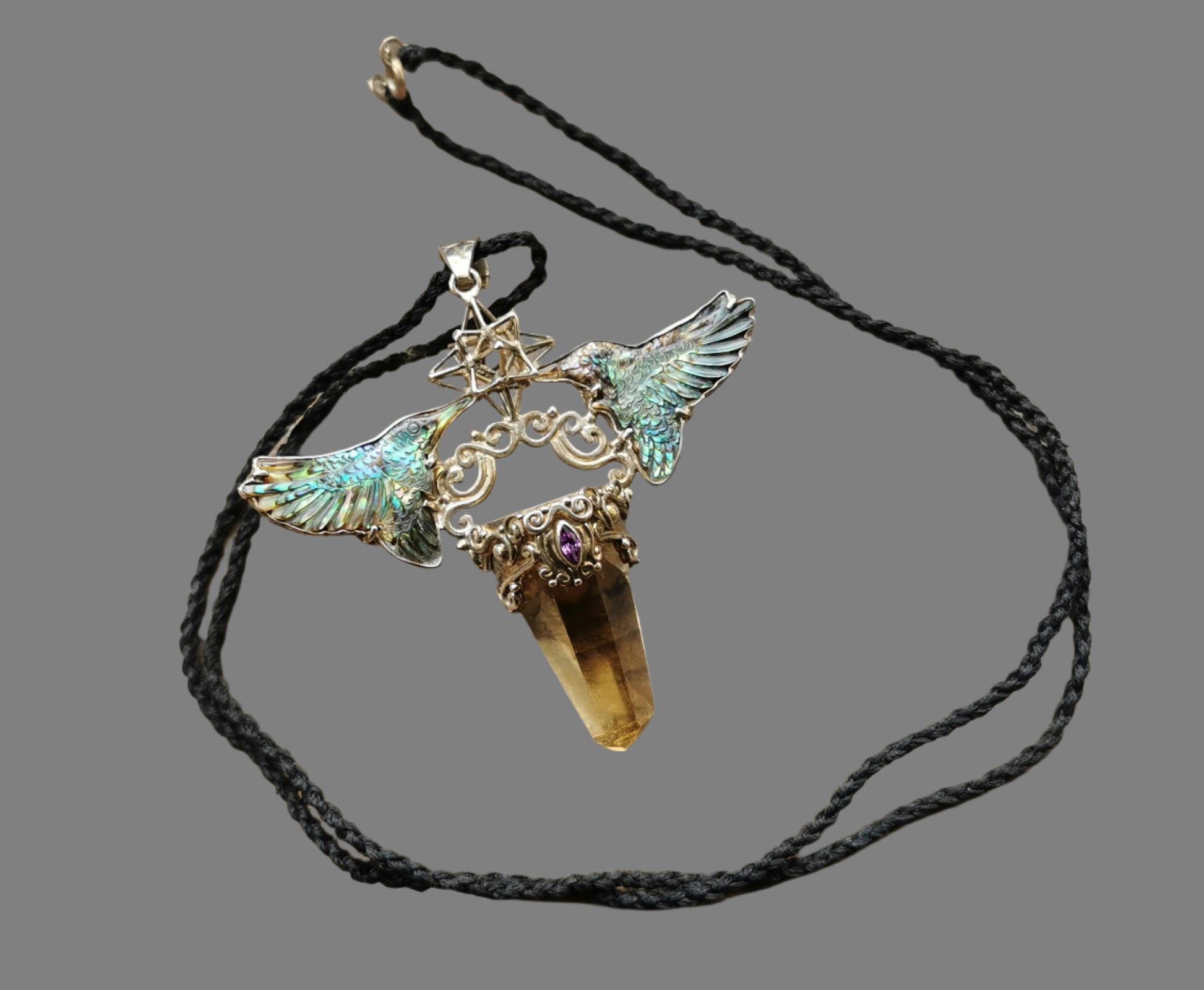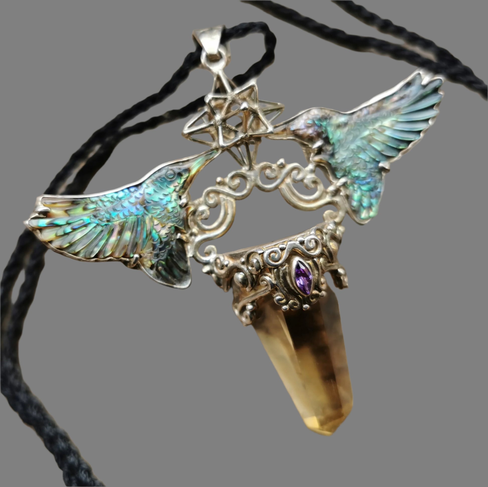 Ref.PD1034 - Silver pendant with Heart Star geometry, abalone shell carved humming birds, citrine, and amethyst gemstones.