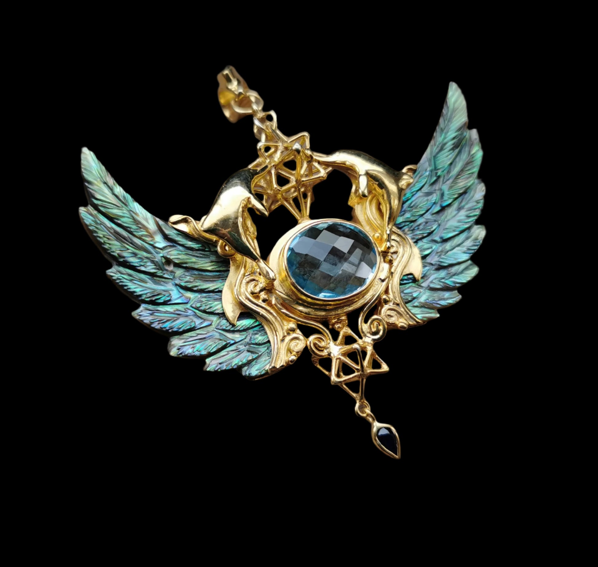 Ref.PD1040 - Gold plated on silver dolphins pendant with Heart Star & Tantric Star geometries, abalone carved wings, sapphire [bale], London blue topaz, and amethyst [drop] gemstones.