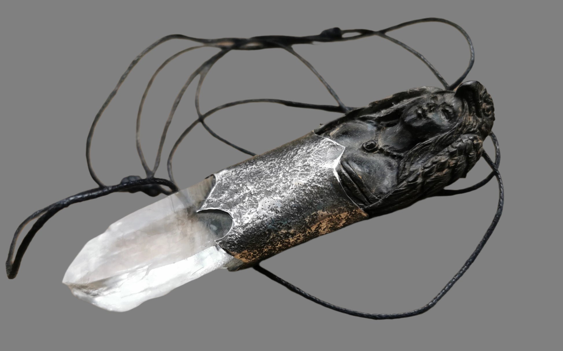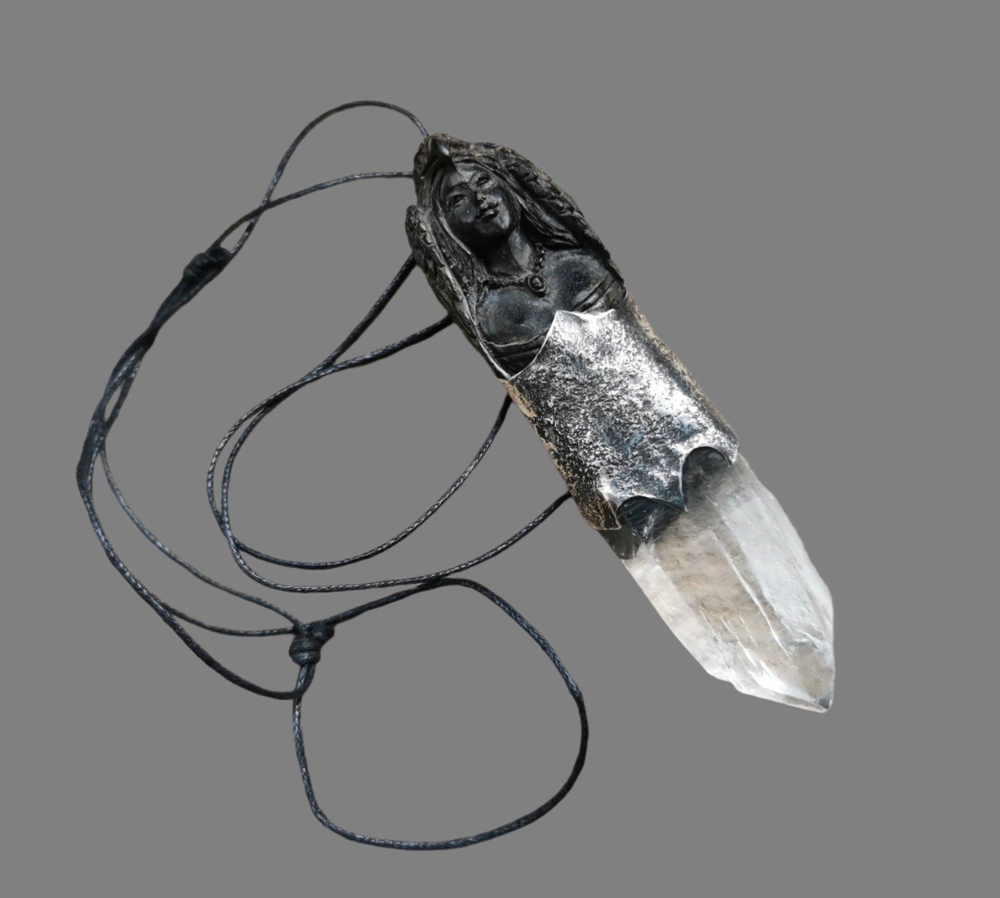 Ref.PD1046 - Silver pendant with ecologically sourced deer horn carved Indian woman w/ eagle, and laser quartz crystal.