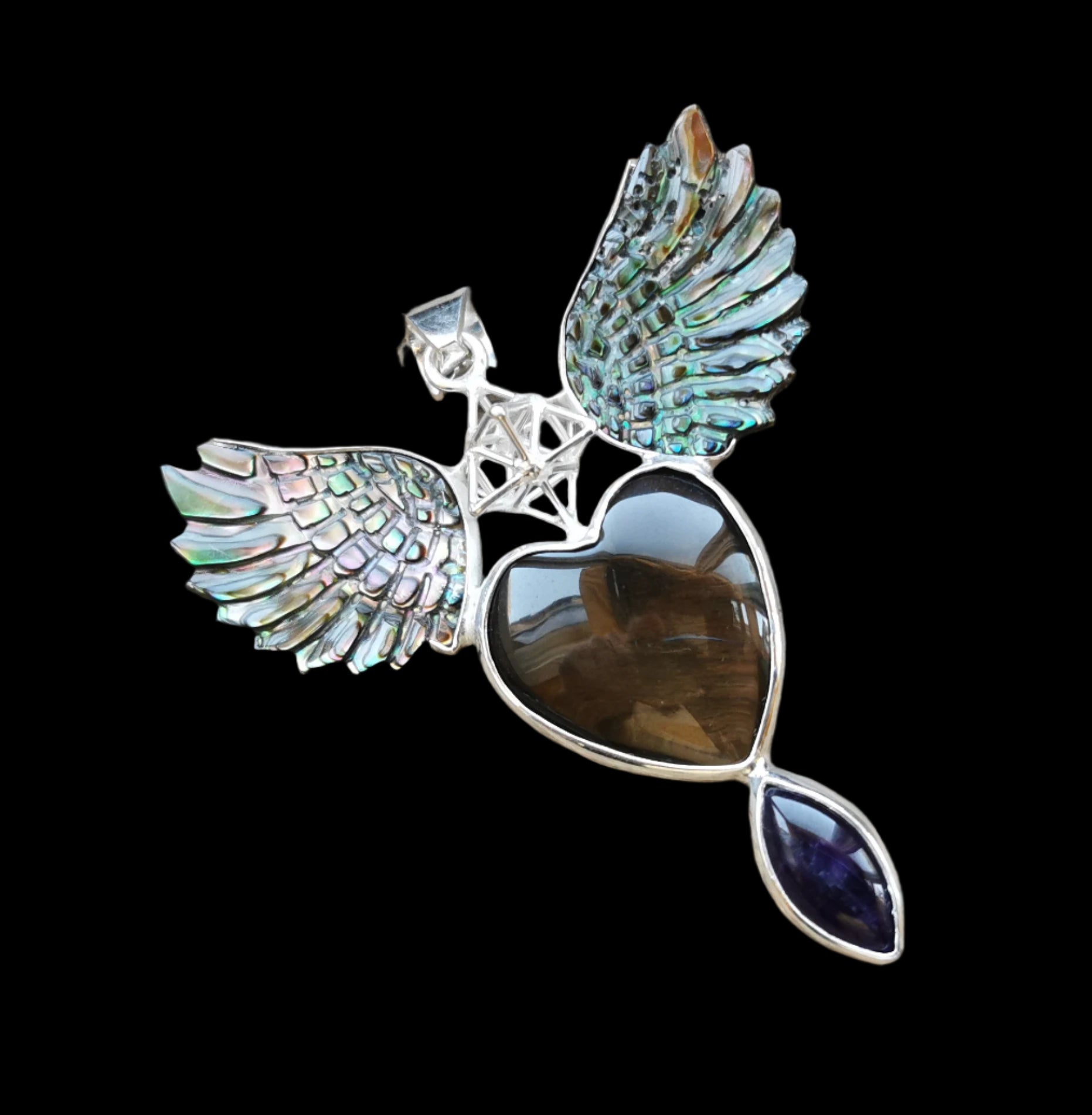 Ref.PD1050 - Silver pendant with Tantric Star geometry, abalone carved wings, smoky quartz crystal, and amethyst gem.