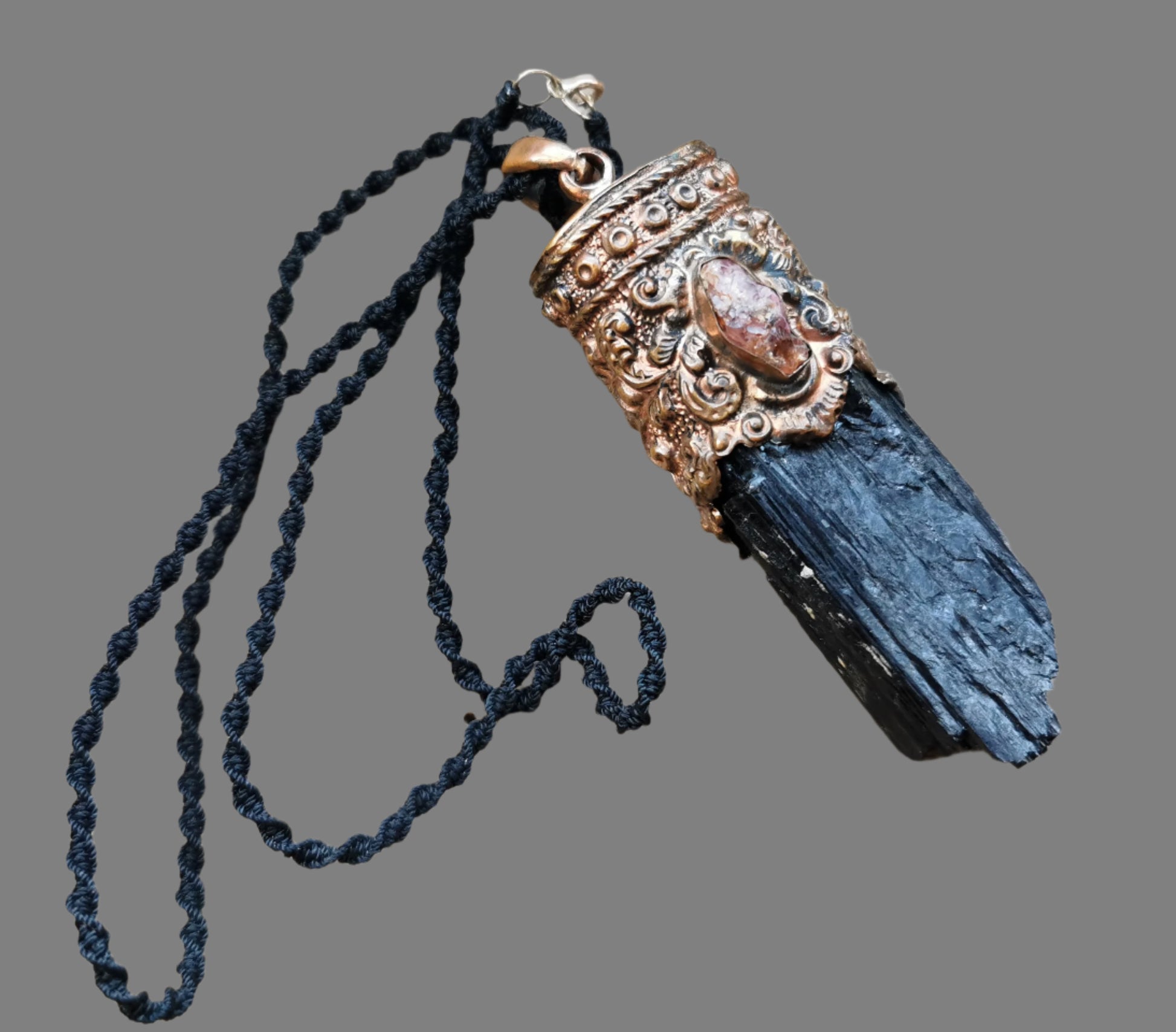 Ref.PD1052 - Repoussé copper pendant with red and black tourmaline gemstone.