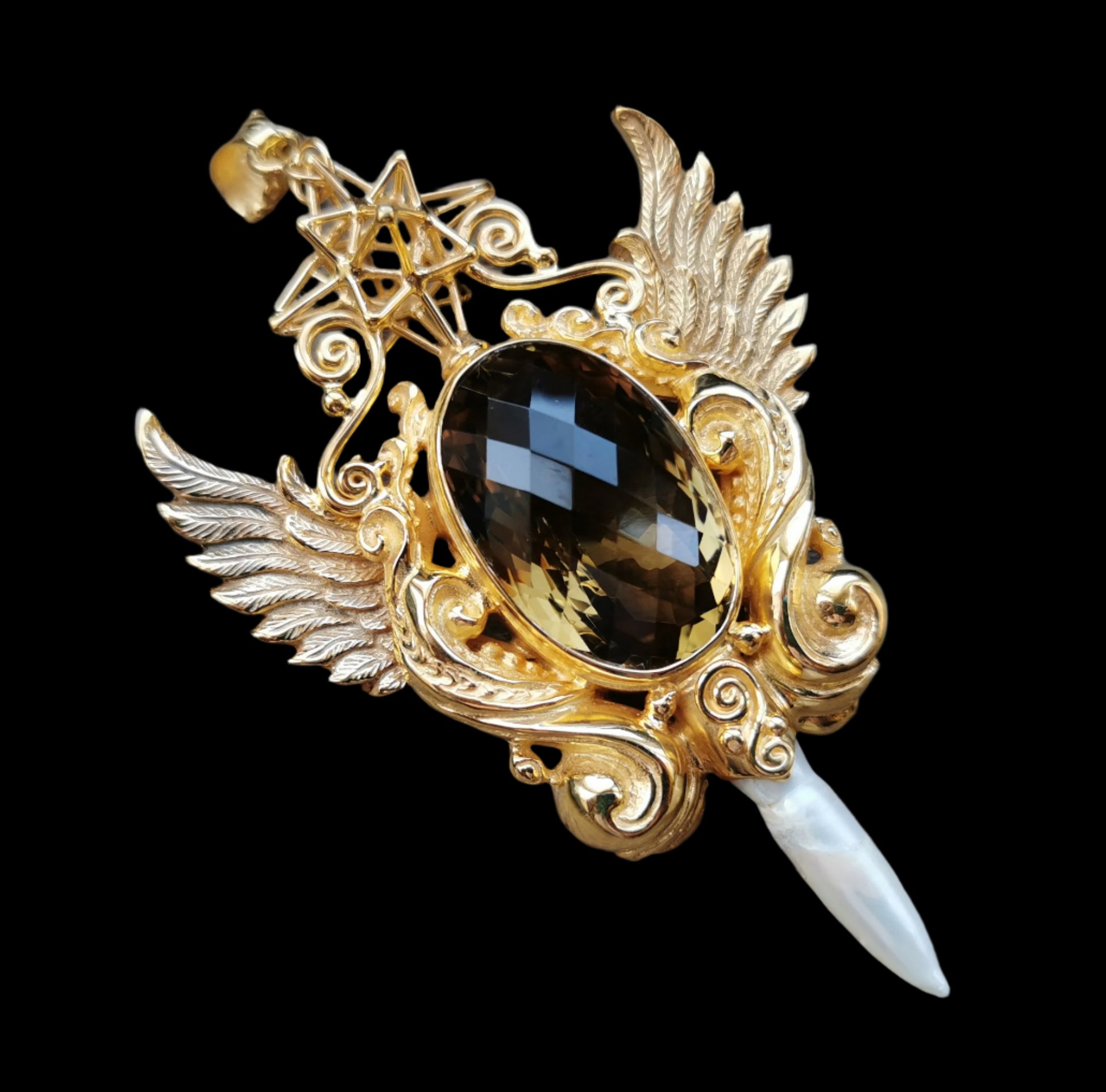 Ref.PD1053 - Gold plated on silver pendant with Heart Star geometry, wings, South see pearl, and smoky quartz crystal.