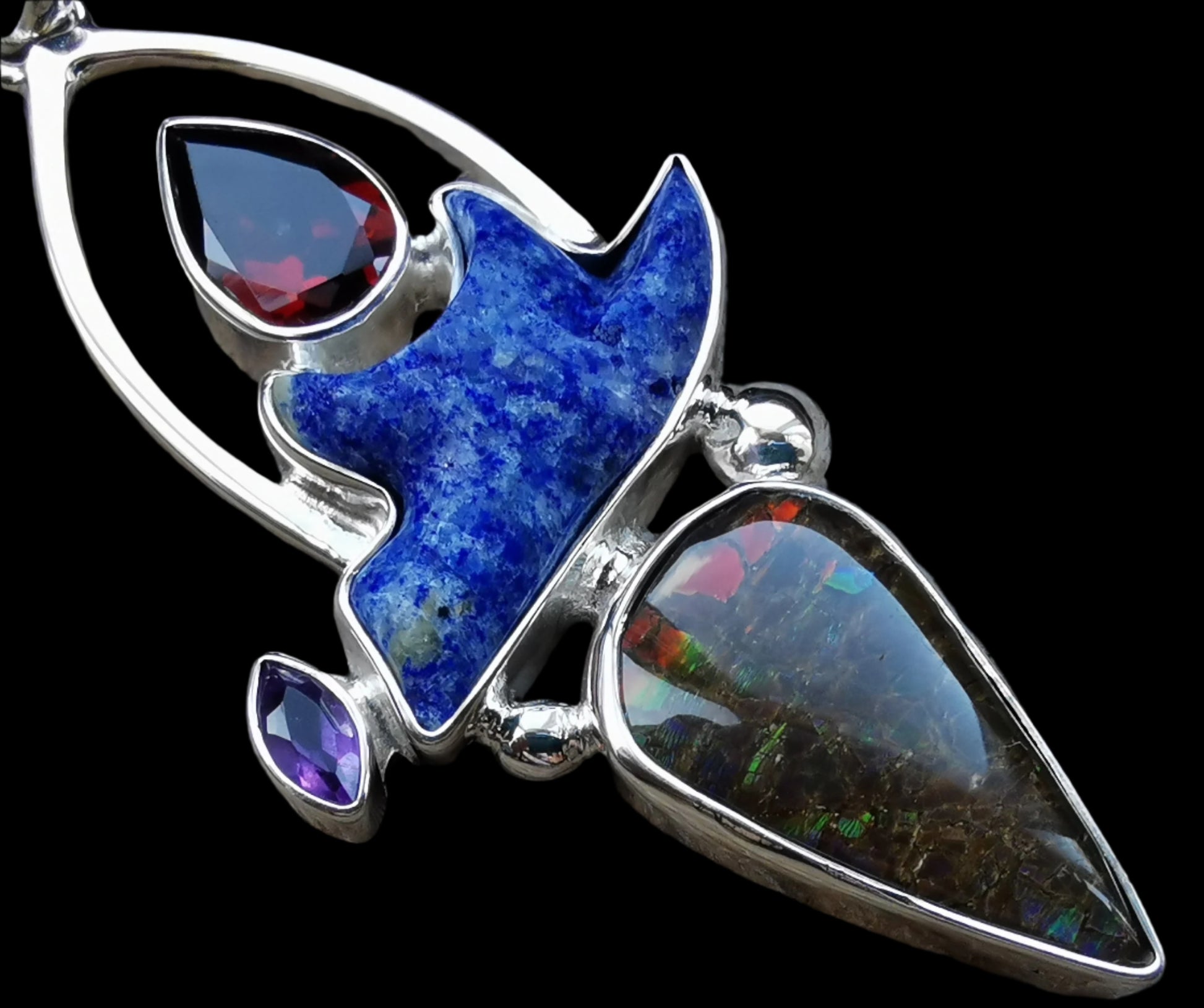 Ref.PD1058 - Silver pendant with ammonite fossil, garnet, lapis lazuli, and amethyst gems.