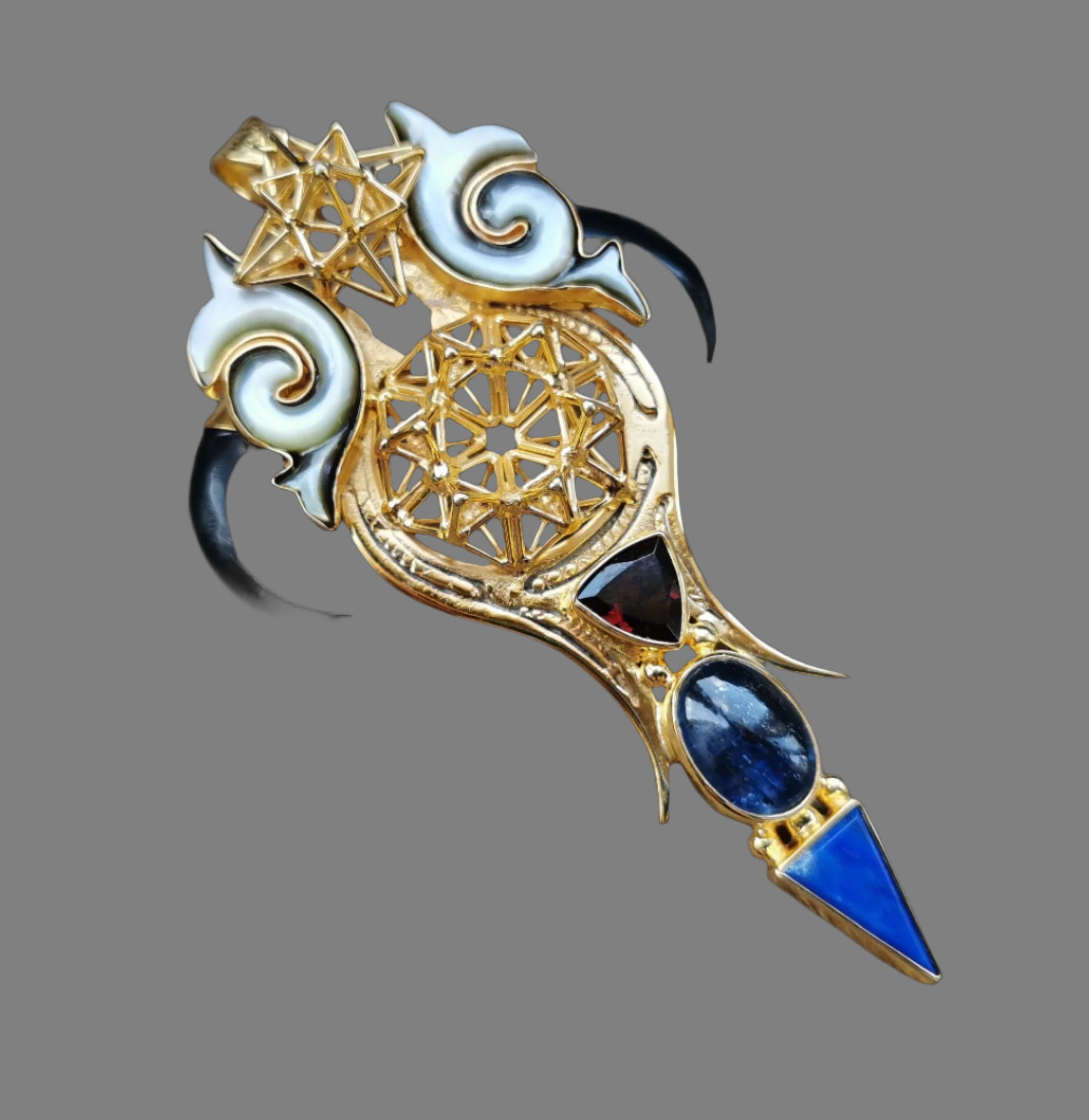 Ref.PD1059 - Gold plated on silver pendant with Heart Star & Hyper Tetra Torus geometries, mother of pearl carved Tibetan clouds, ecologically sourced buffalo horn carved hawk claws, garnet, polished kyanite, and lapis lazuli gemstones.