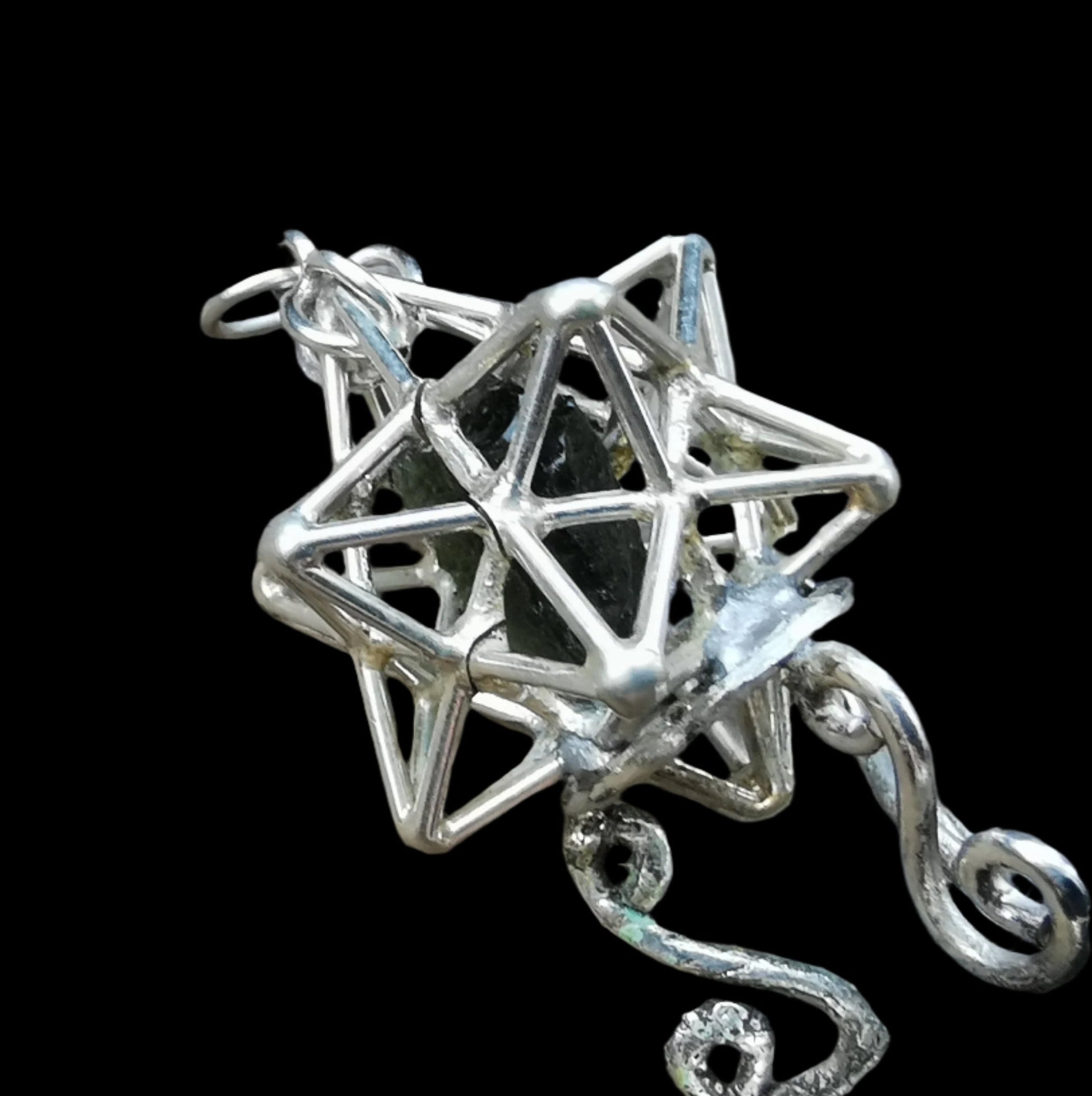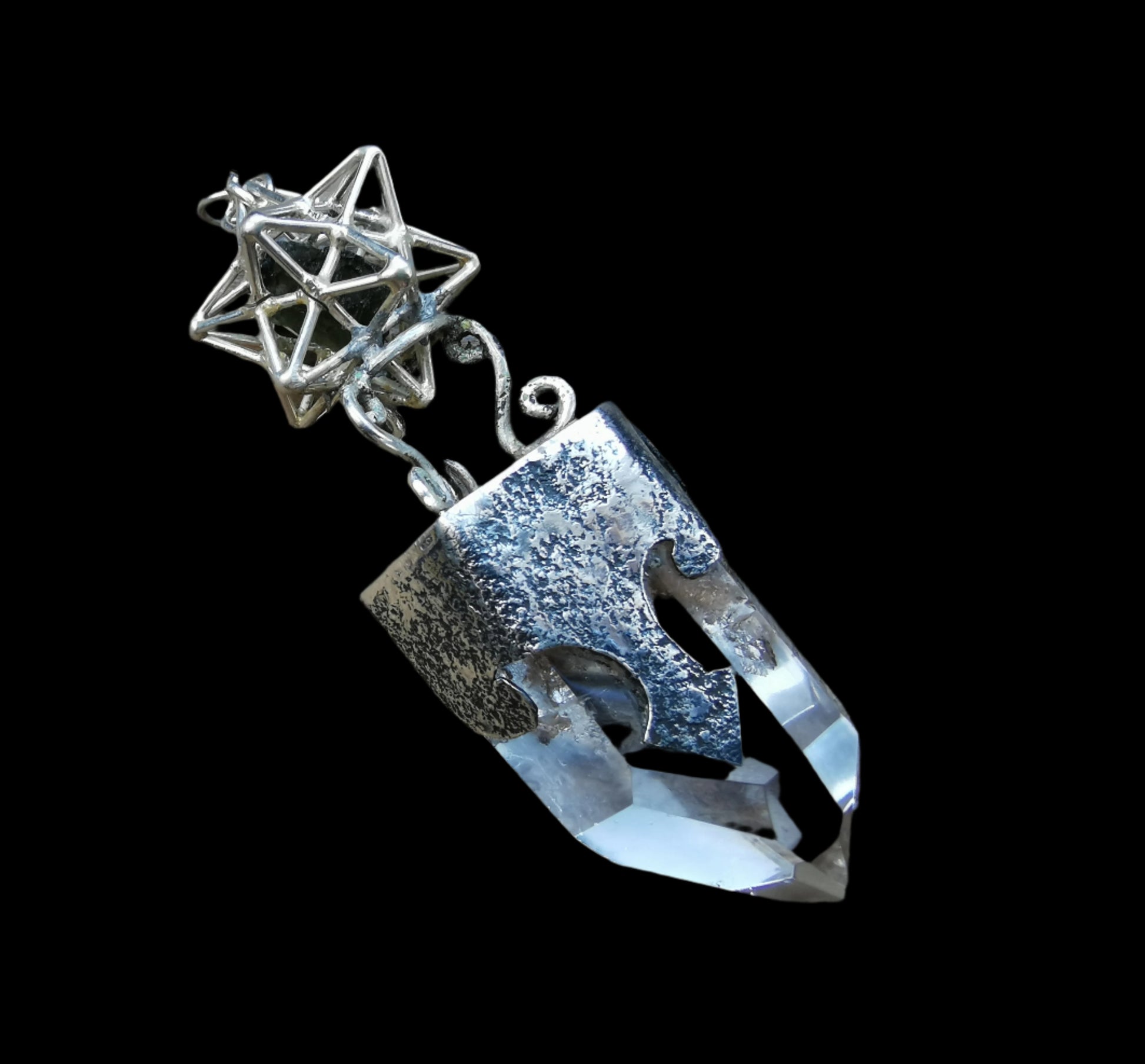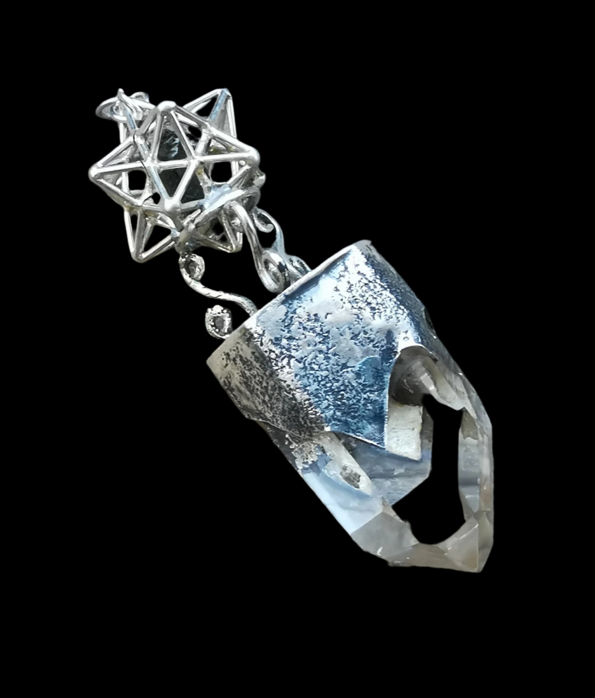 Ref.PD1063 - Silver pendant with Solar Star geometry, clear quartz crystal, and moldavite gemstone.