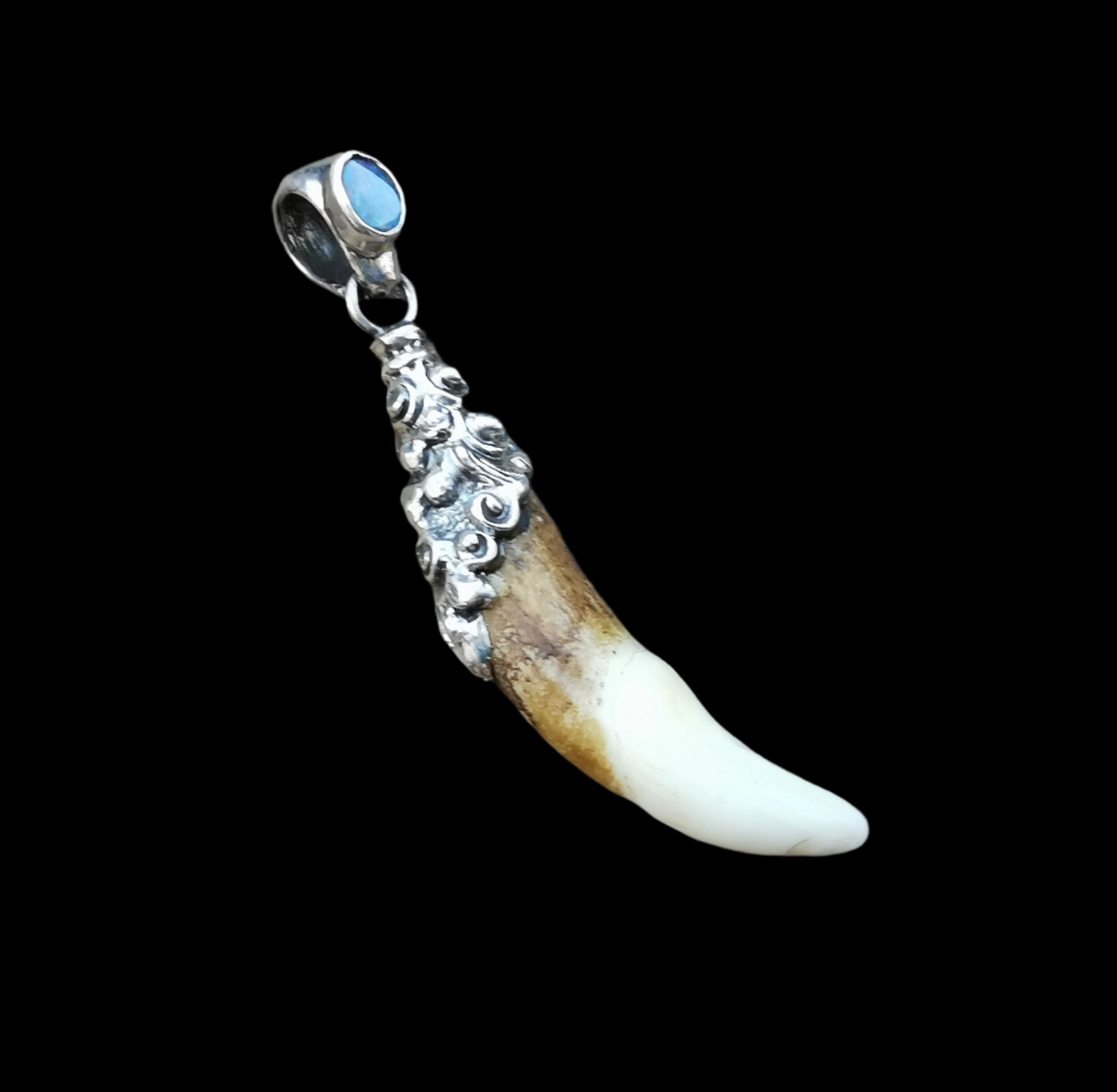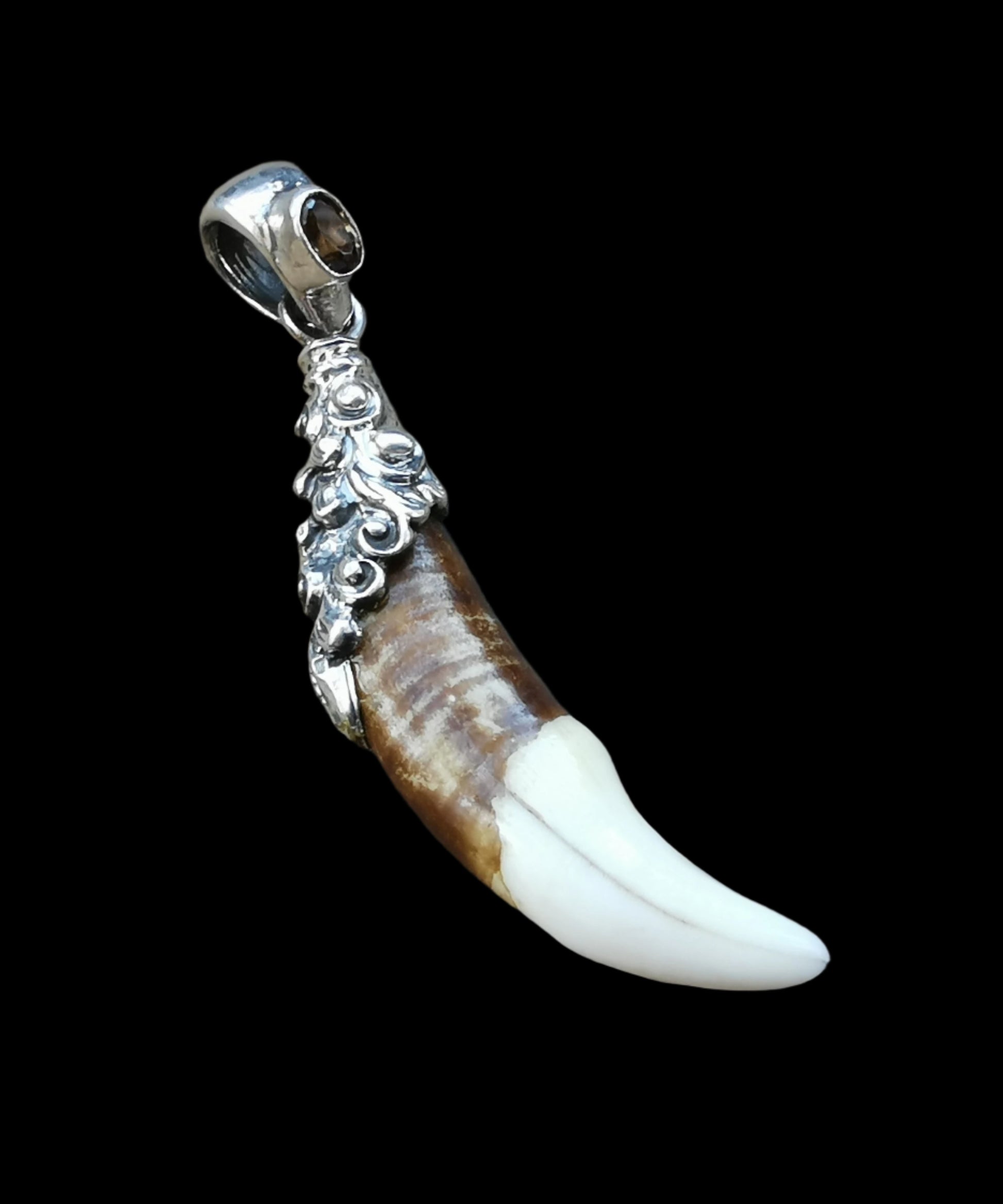 Ref.PD1068 - Silver pendant with ecologically sourced wolf tooth, and gemstone.