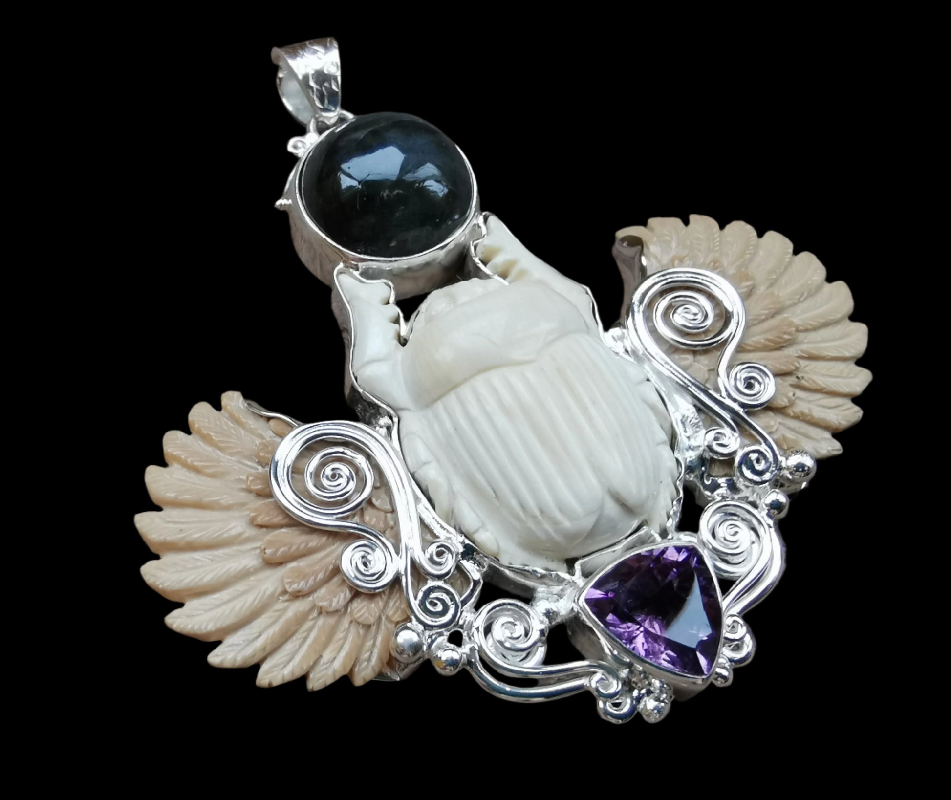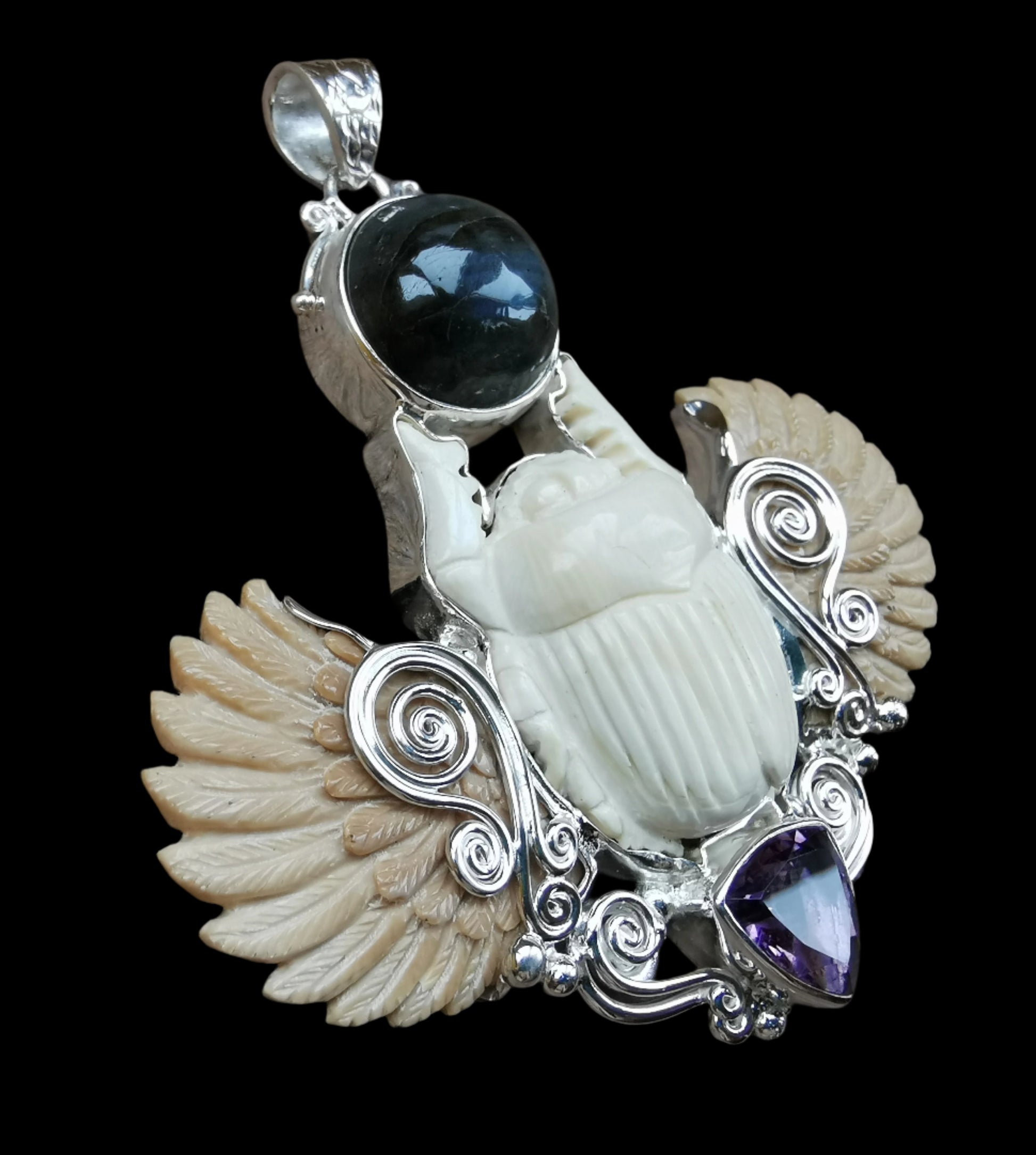 Ref.PD1070 - Silver pendant with mammoth carved scarab+wings, labradorite, and amethyst gemstones.