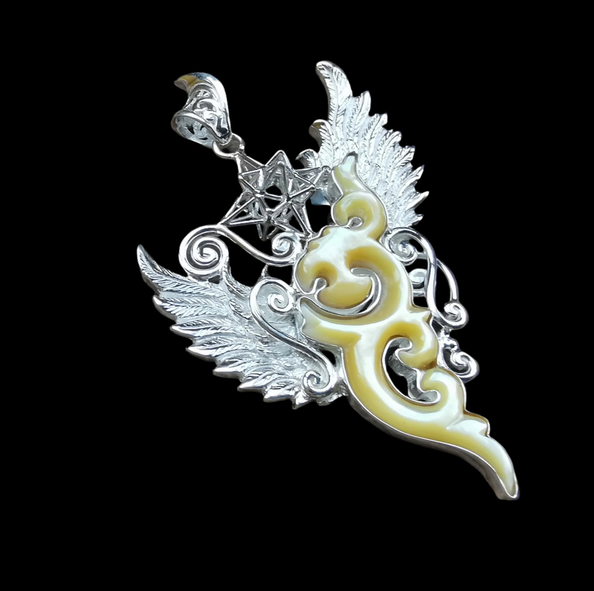 Ref.PD1071 - Silver pendant with Heart Star geometry & wings, and mother of pearl carved decoration.