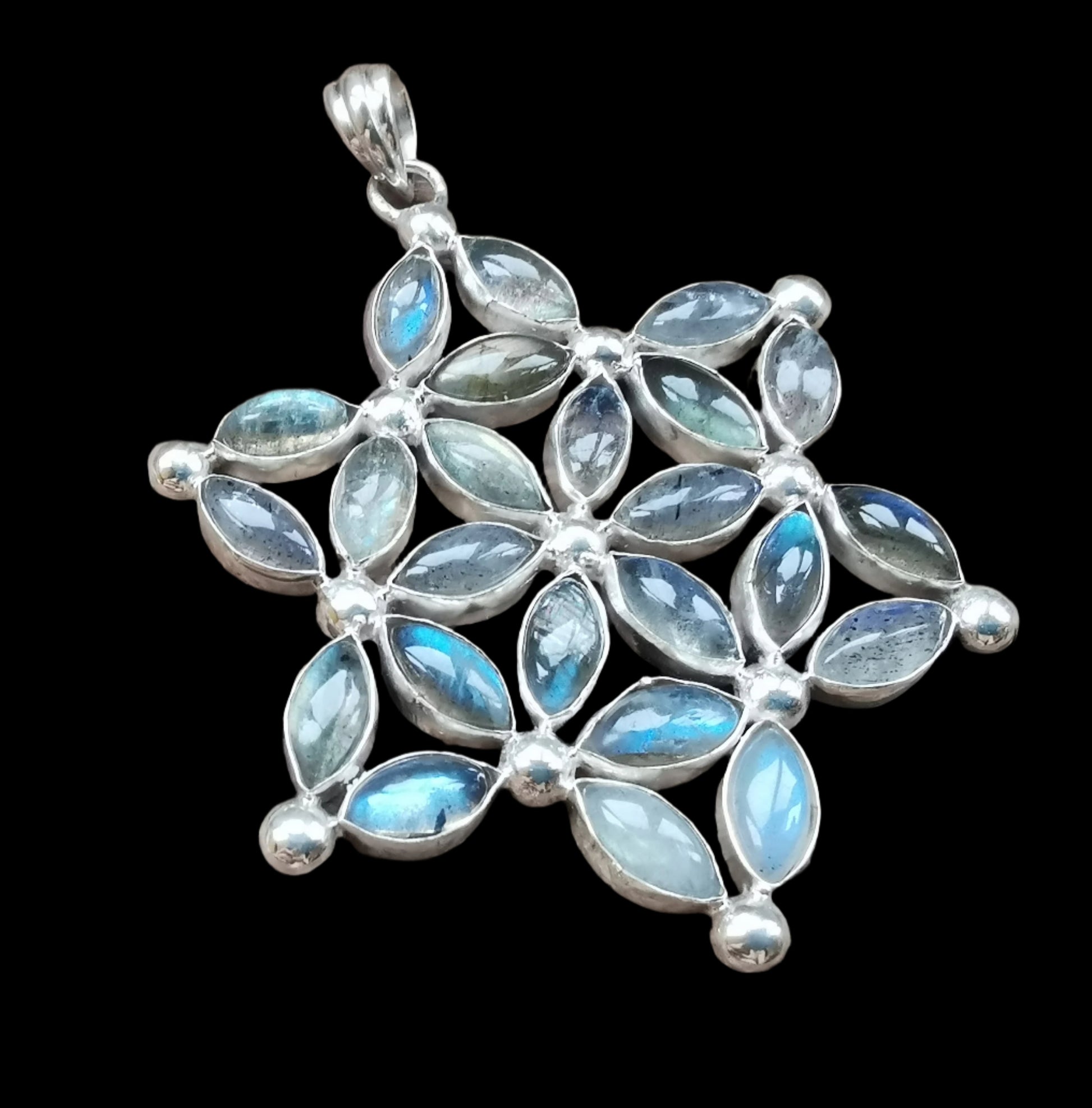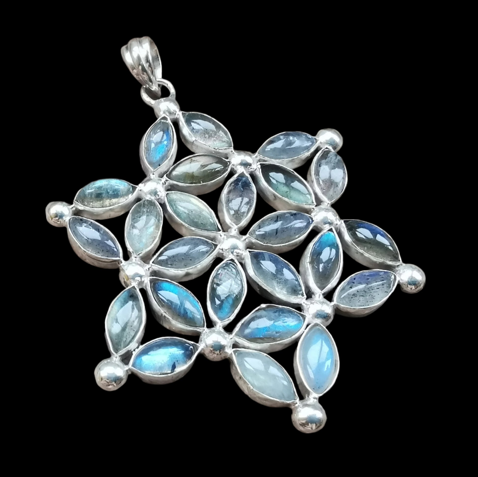 Ref.PD1080 - Silver pendant with labradorite gems depicting a Solar Mandala geometry.
