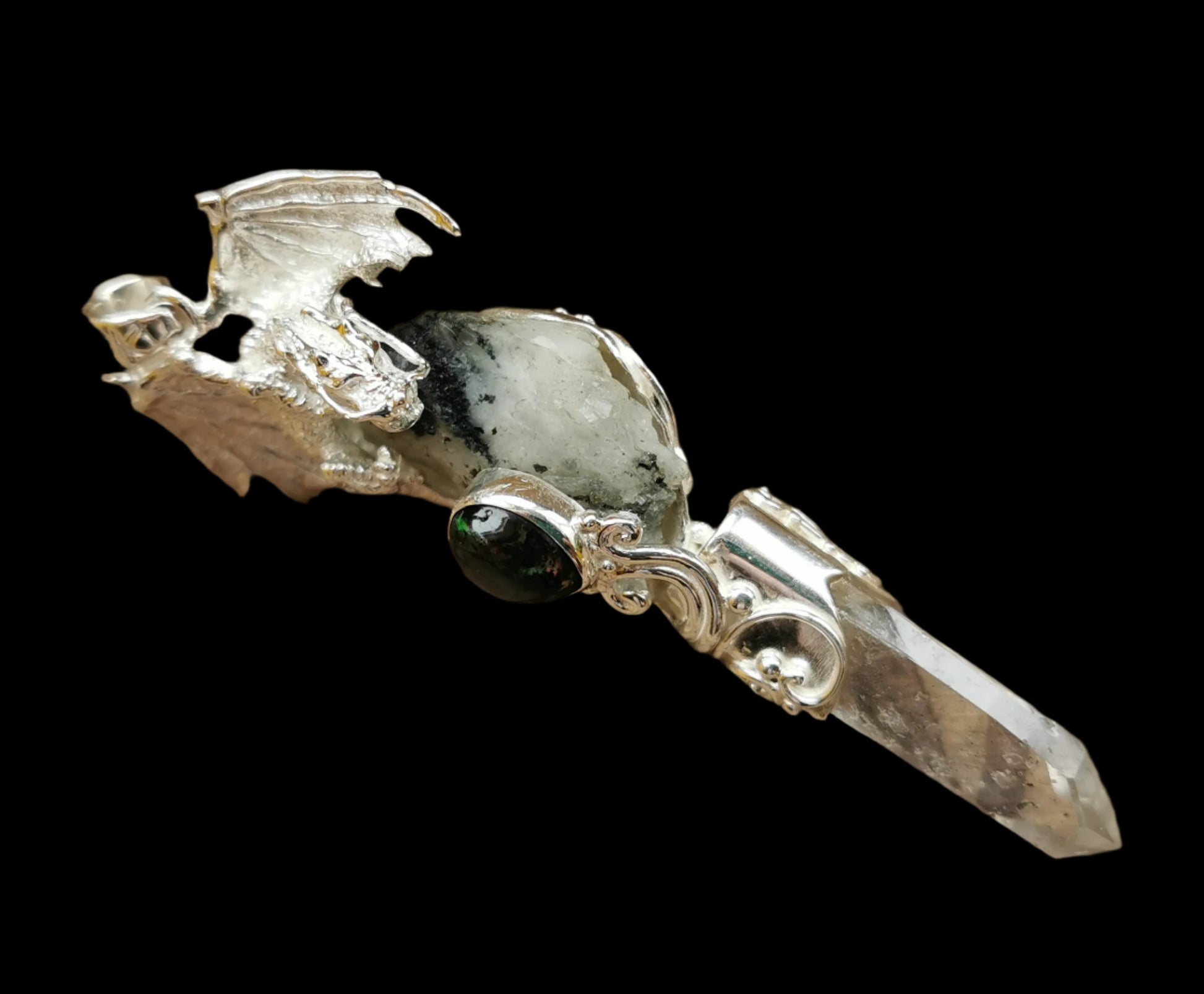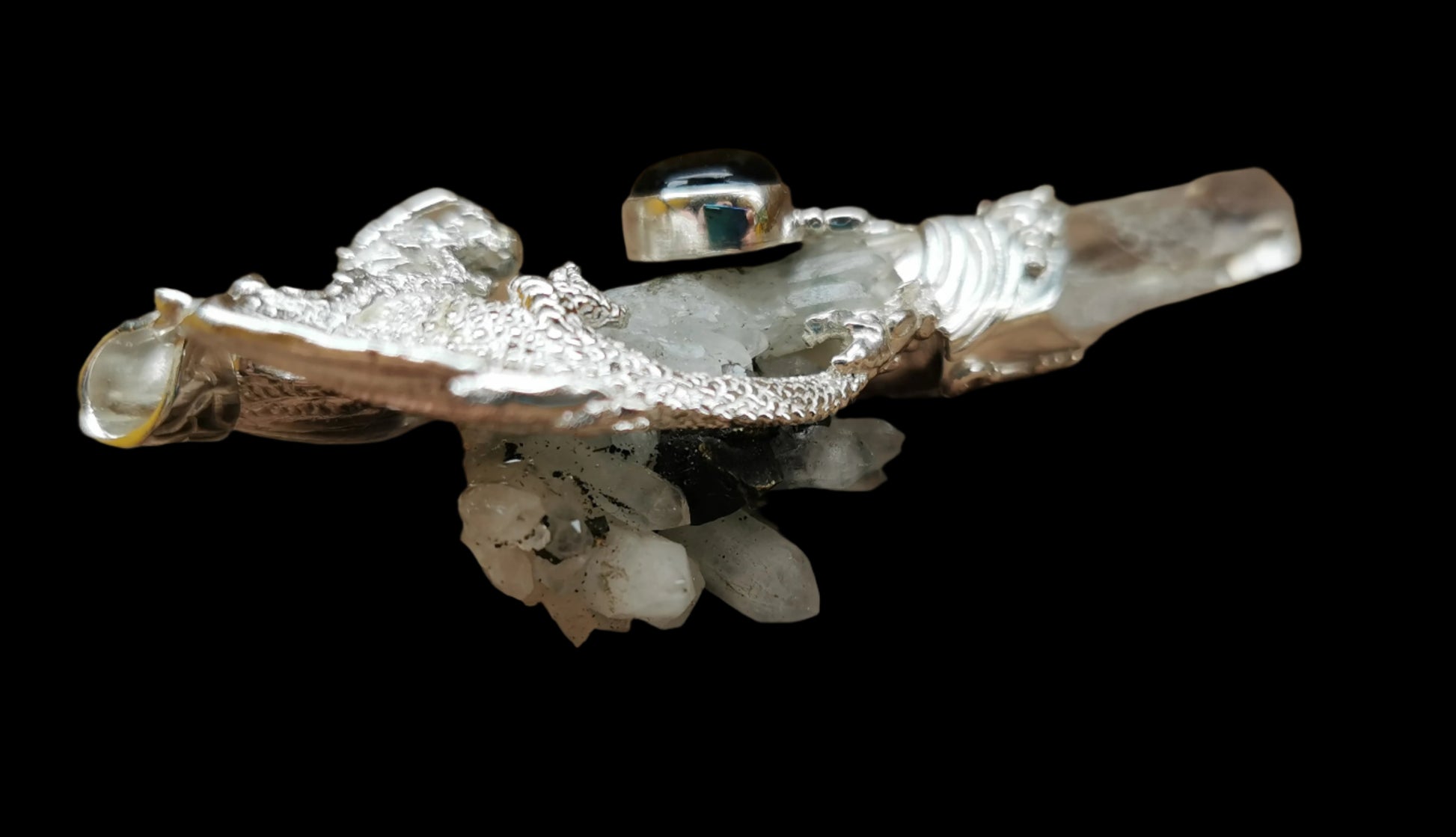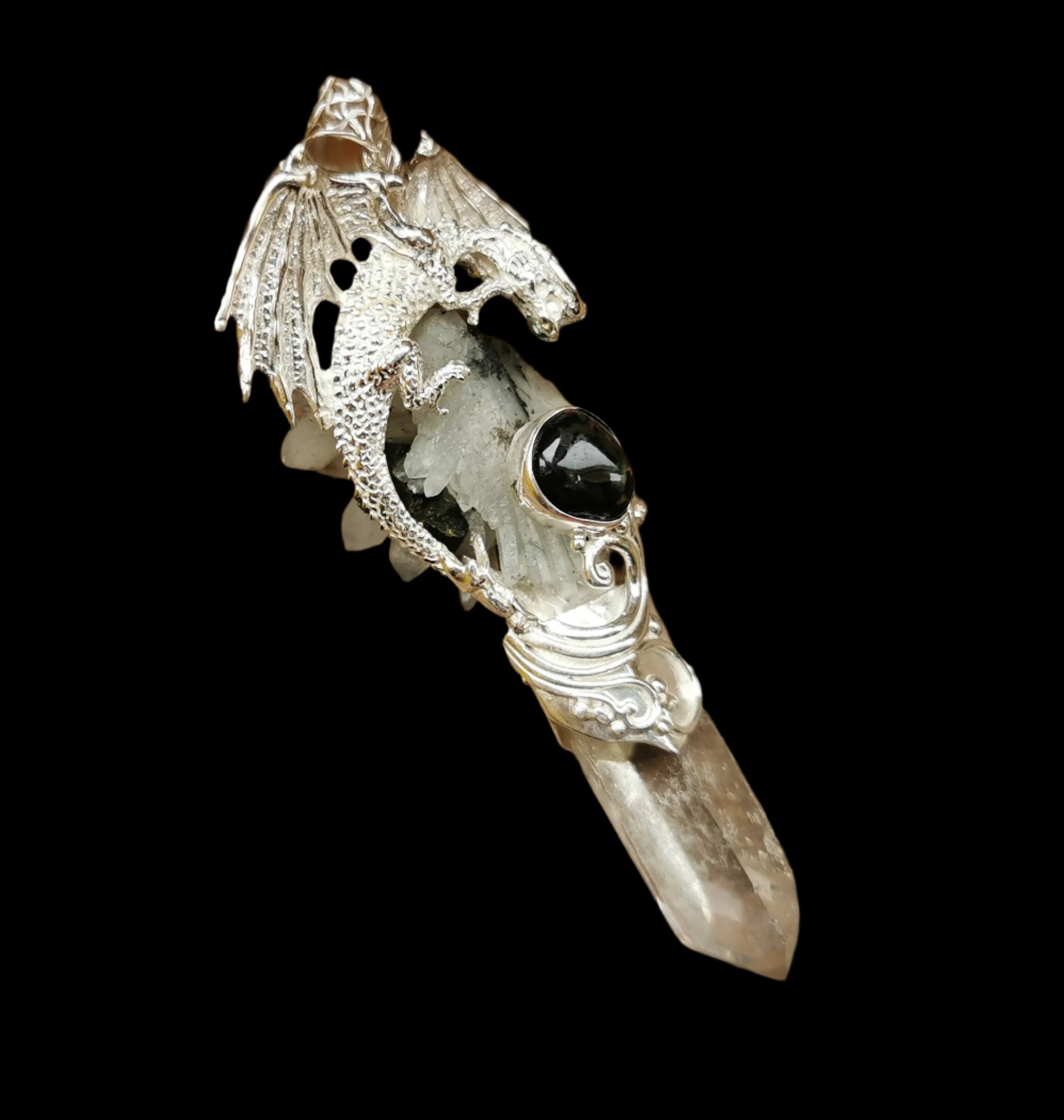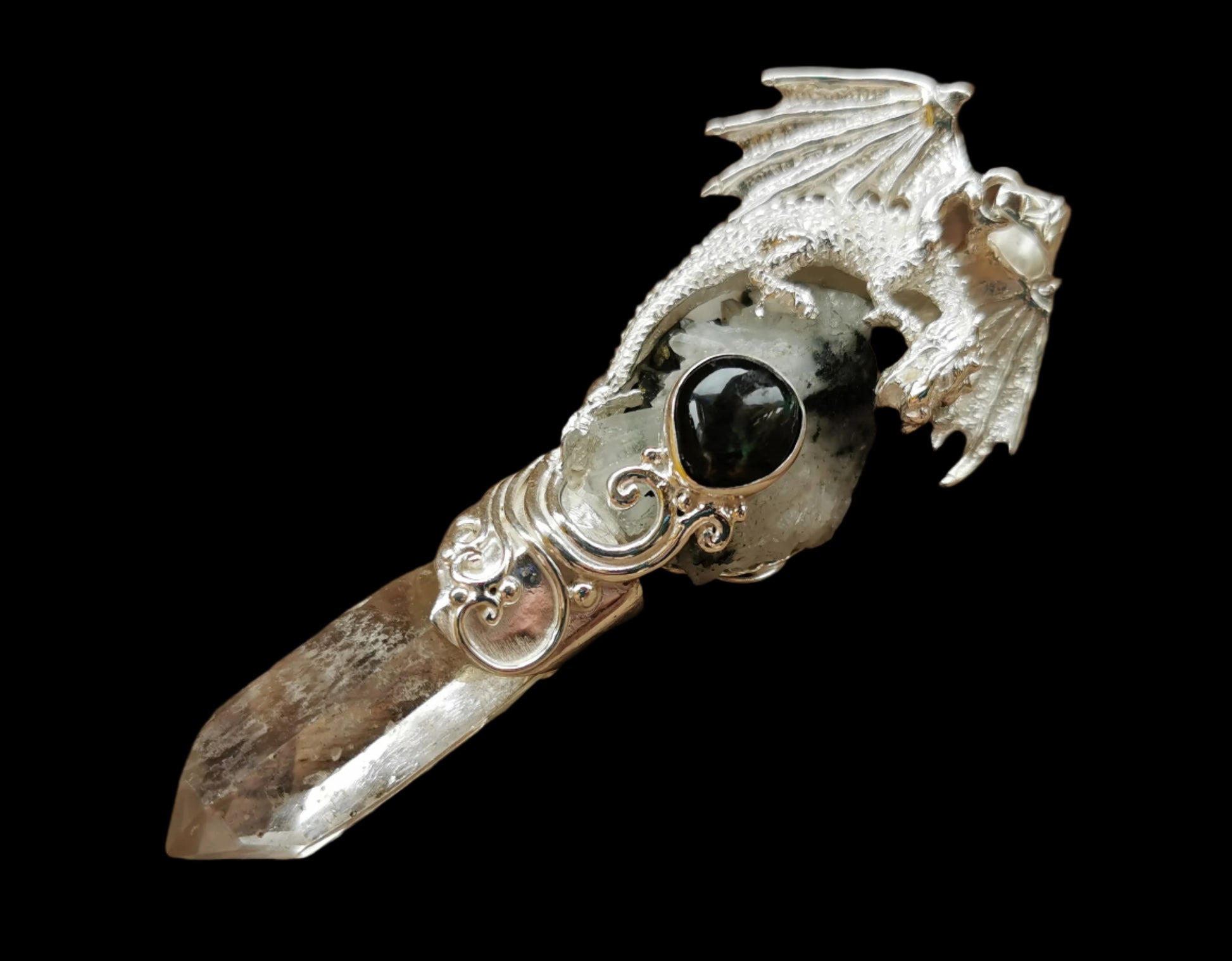 Ref.PD1083 - Silver pendant with dragon motif, ammonite fossil, chlorite quartz crystal crystal, and laser quartz crystal.