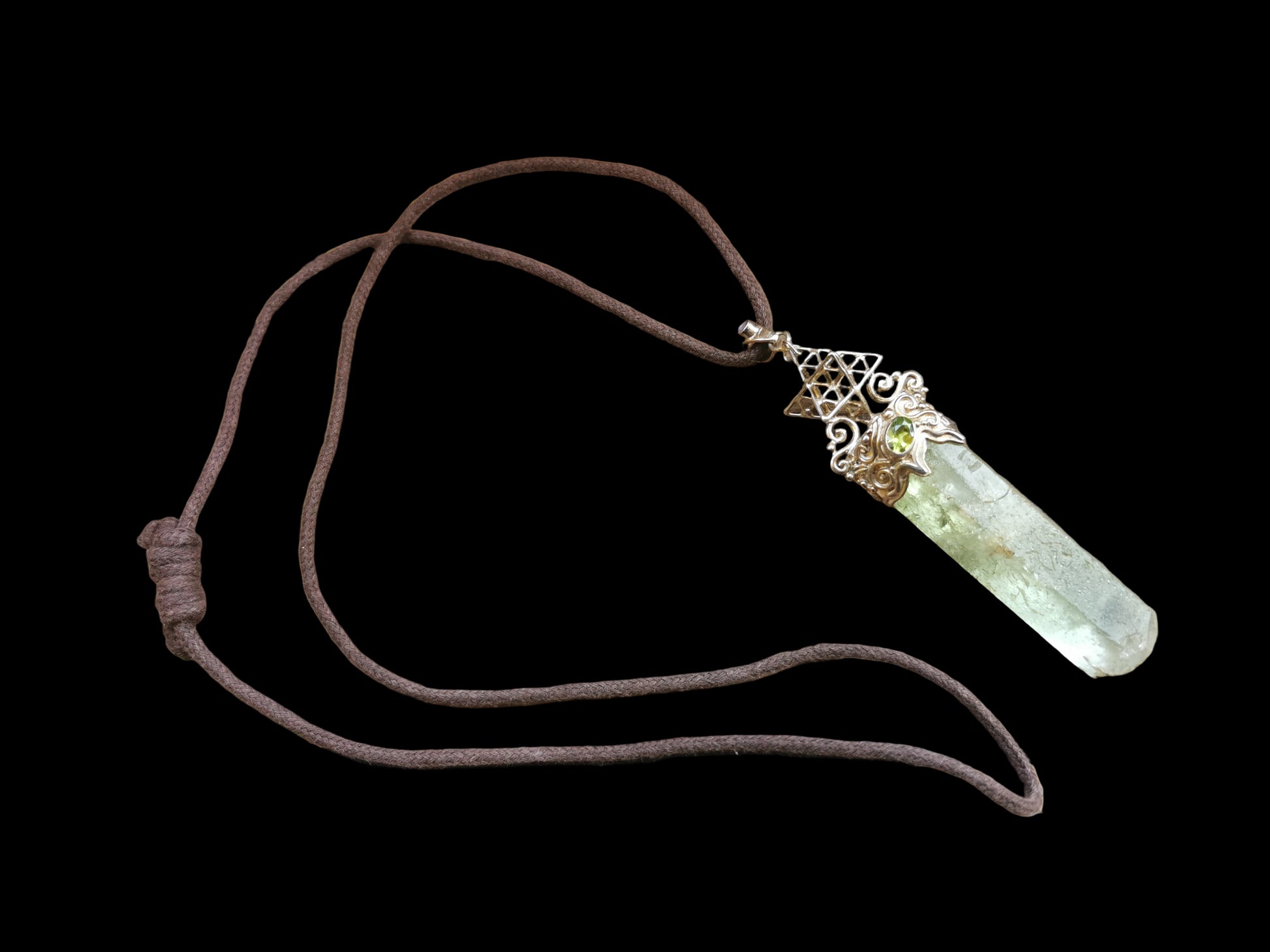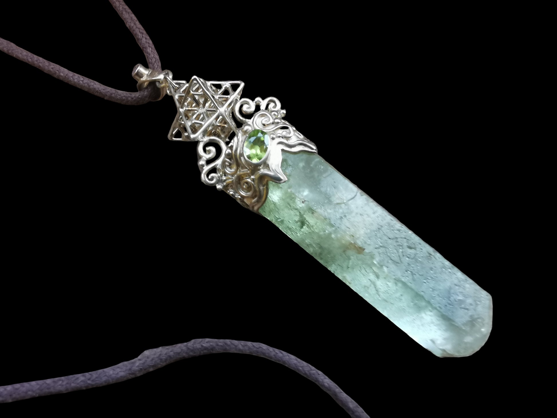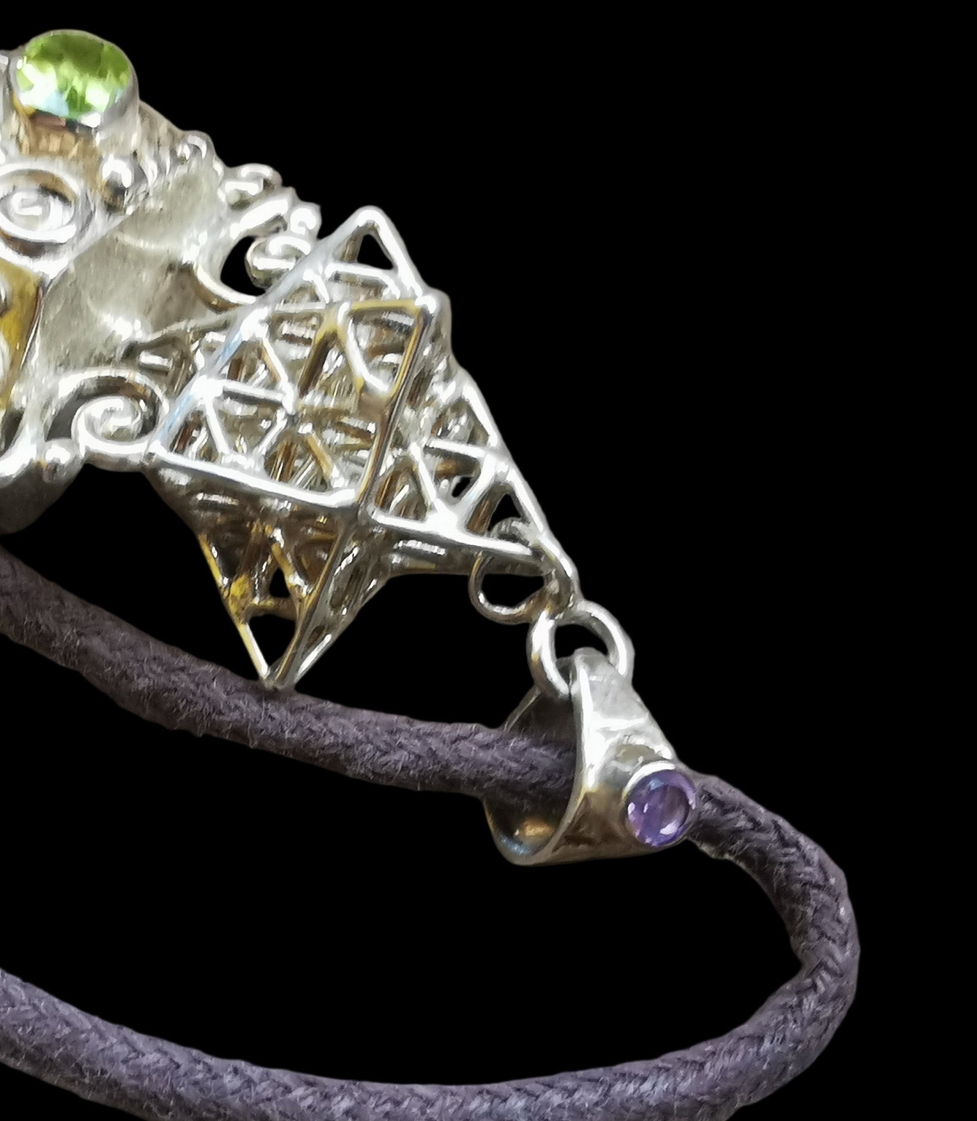 Ref.PD1088 - Silver pendant with Tantric Matrix geometry, green beryl, amethyst [bale], and peridot gemstones.