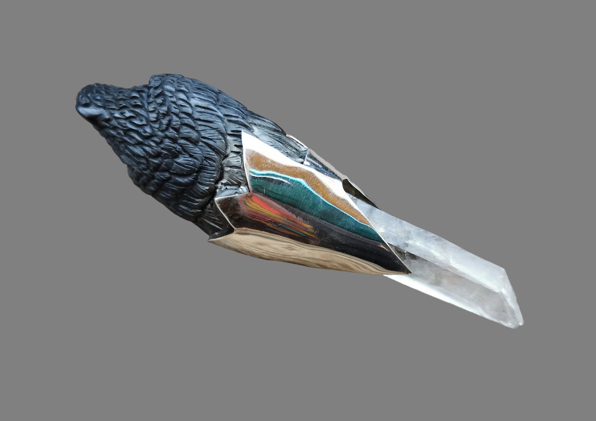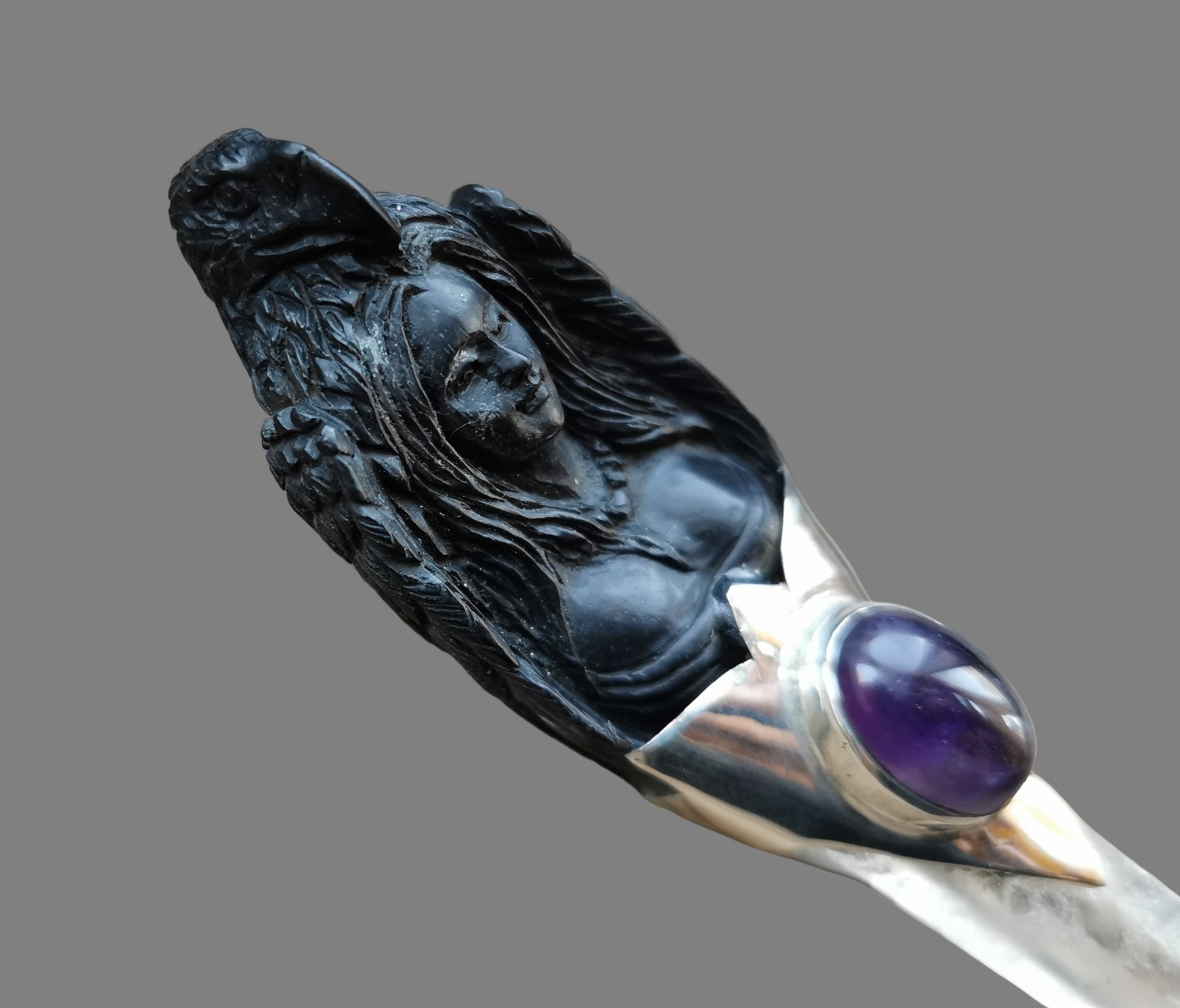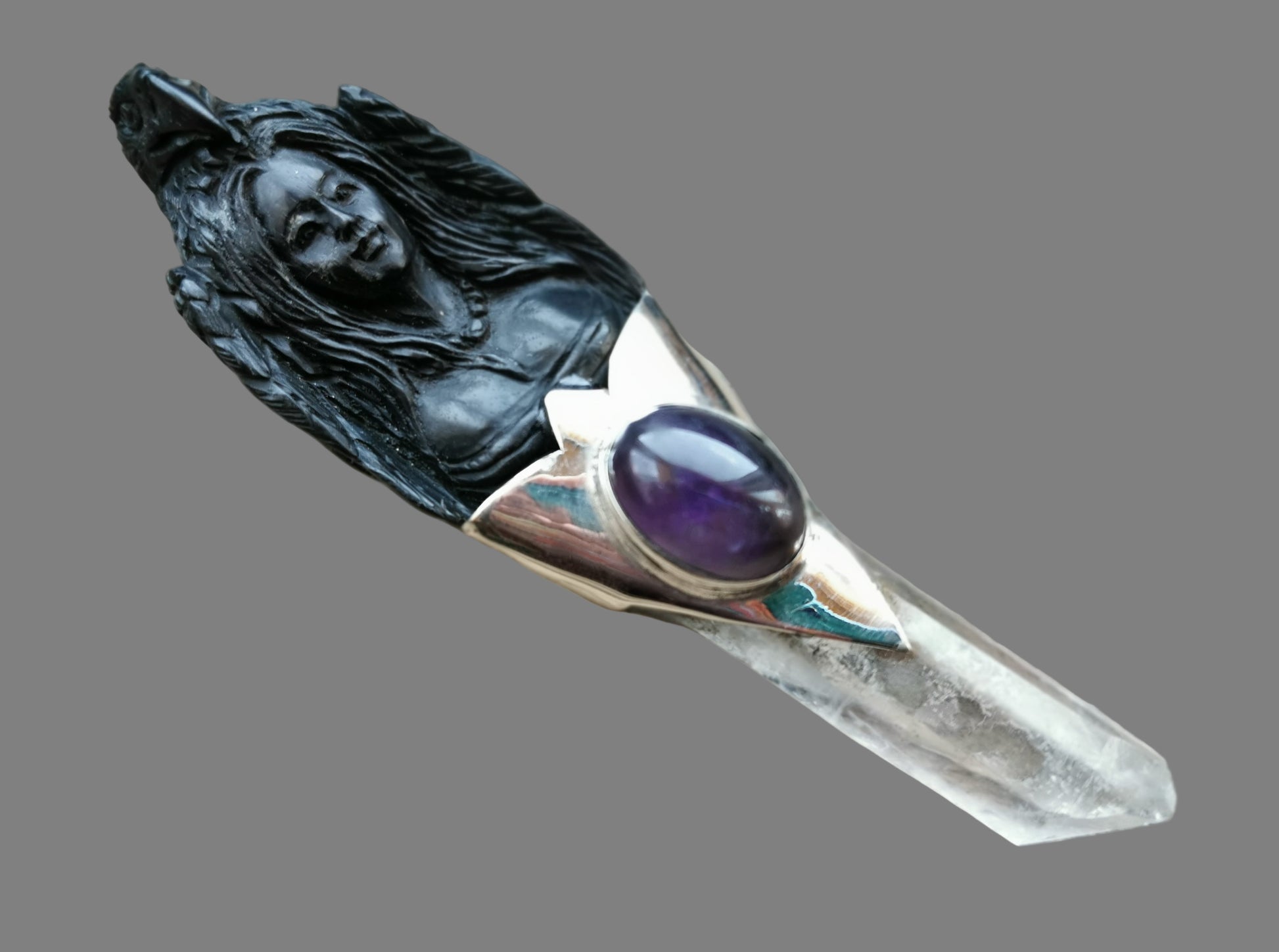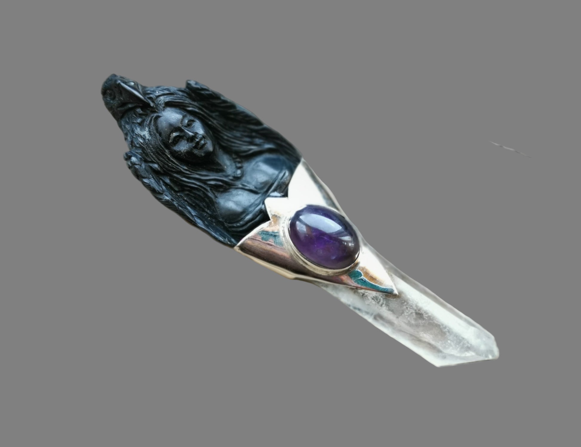 Ref.PD1090 - Silver pendant with ecologically sourced deer horn carved Indian woman w/ eagle, amethyst gem, and laser quartz crystal.